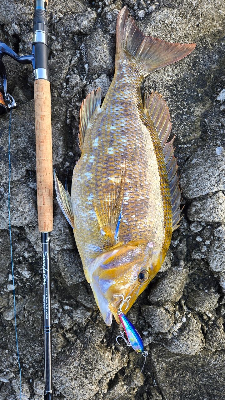 大型カンパチは時合から遅れて来るイメージがあるので、釣れる気は全くしないけどモンスターショット140を投げ続ける。ボトムから誘い上げているといきなり重量感のある当たり!大型のカンパチかと思ったらまさかのタマン😂