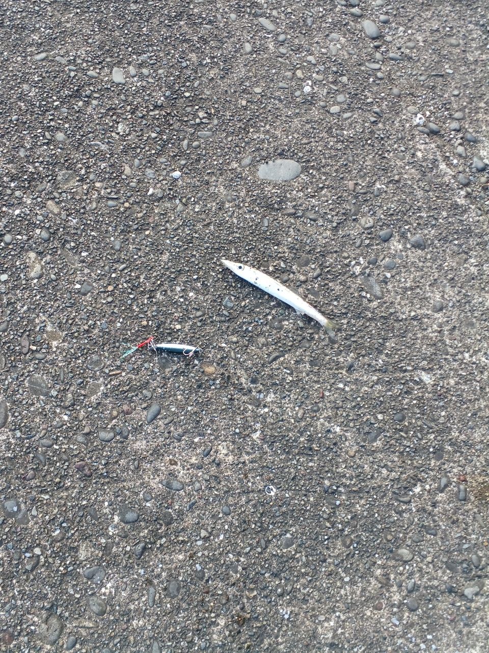 しばらくキャスト練習をしているとカマスがヒット、無事に鱗付け完了。