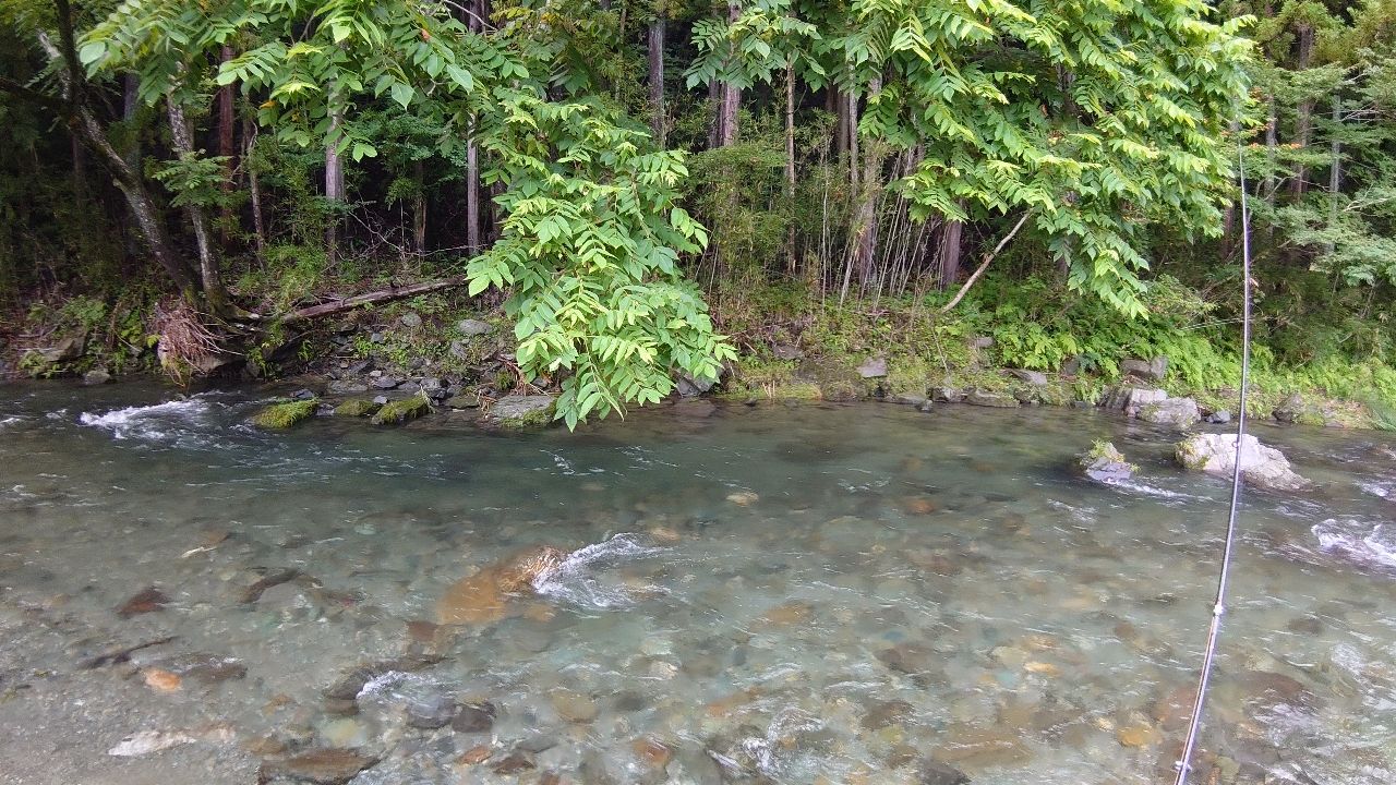 さらに遡行し、小さい淵にも丁寧に打っていく。 ブッシュを見たら打つ。
