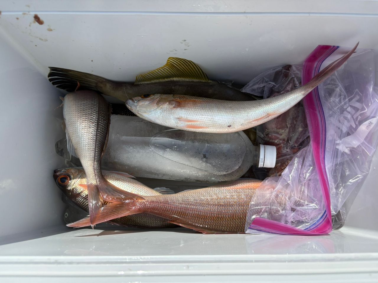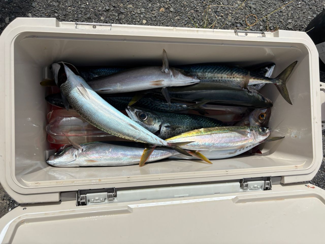結果はスルメイカ4 、ヒメダイ10、ムロアジ4、サバ5、マヅラ1。クーラーは満タンになりました。