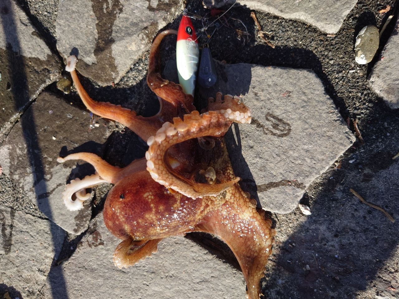 今日は足下で釣れました🐙1回ゴミかな?というような感じで抜けてしまったのですが、数分後に同じ様な感触があり上げて来たらタコでした✨️