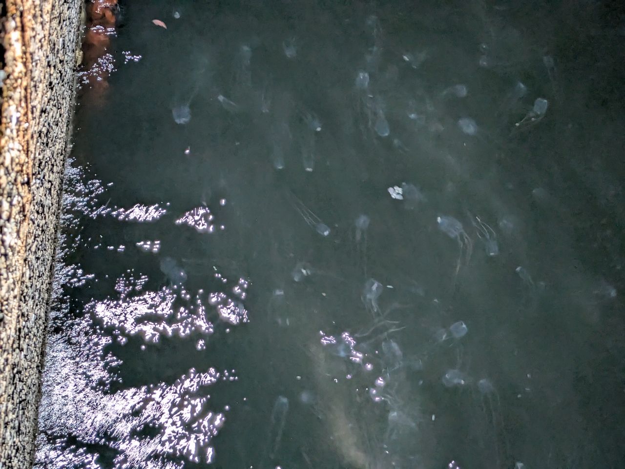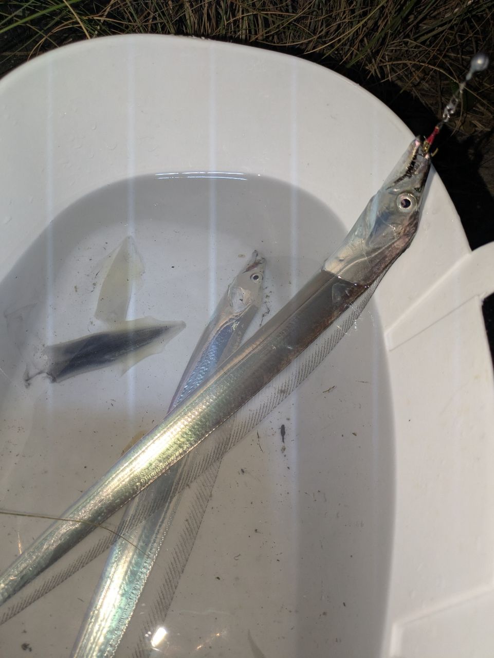 工業港の中では、大量のトウゴロウイワシがひしめく(②はアンドンクラゲ+トビウオ幼魚)。風裏とまではいかないが、影響の少ないエリアでタチウオを探すも❌️