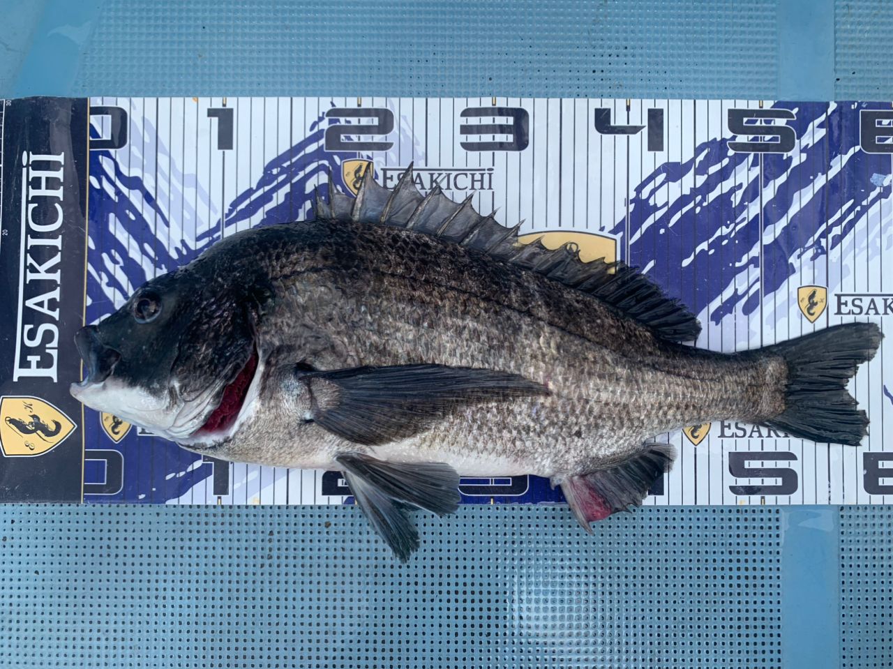 その後潮流が早くなり食いが渋る中、4Bのガン玉を打ち、コーンの1粒刺しで、団子から敢えて跳ね上げさせ、潮流に餌がなびく様にすると、団子が割れて直ぐにしっかりとした押さえ込みアタリが!合わせると重量感はあるが、他の黒鯛とは明らかに違う引き!戸惑いながらやり取りをすると、とてつもない大きな黒鯛が!!メジャーを当てると59cm!?とてつもない大きさに頭が追いつかない!!