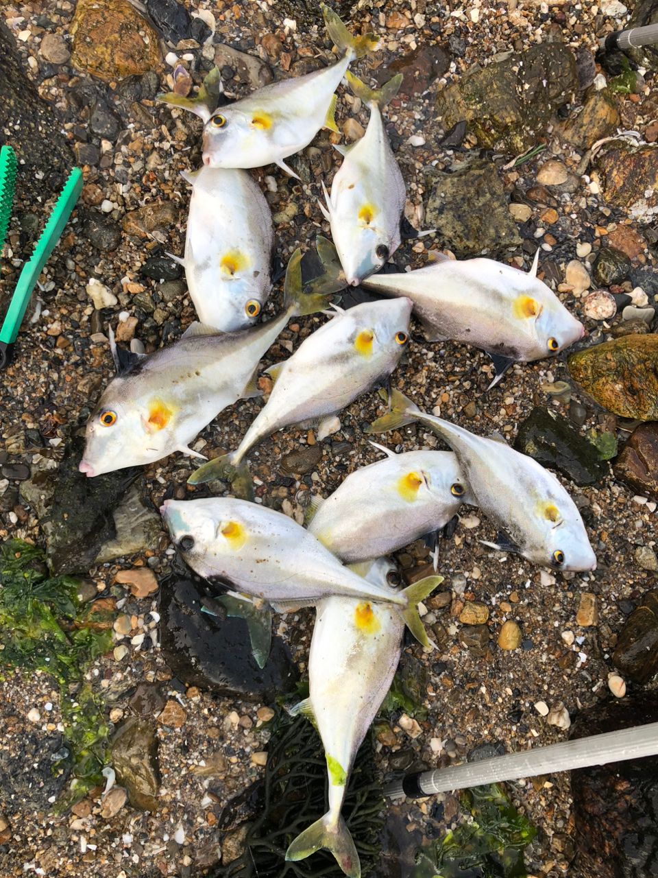 朝4時から知多方面にキス釣りに行ってきました🎣一投目から良いサイズのギマが釣れて上げる時に滑って転んで擦りむいてラテオが折れた😭
