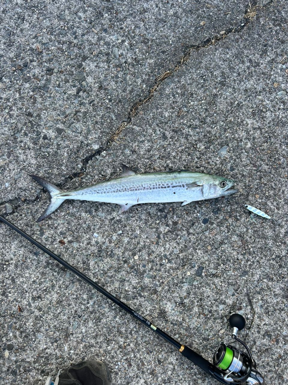 朝マズメアジングでチーバス一本、ジグでサゴシ(口→外れて背中)、そして9時過ぎに太刀魚(こっちも口→お腹)と渋い中でしたがポツポツ魚とのコンタクトが取れてよかったです。