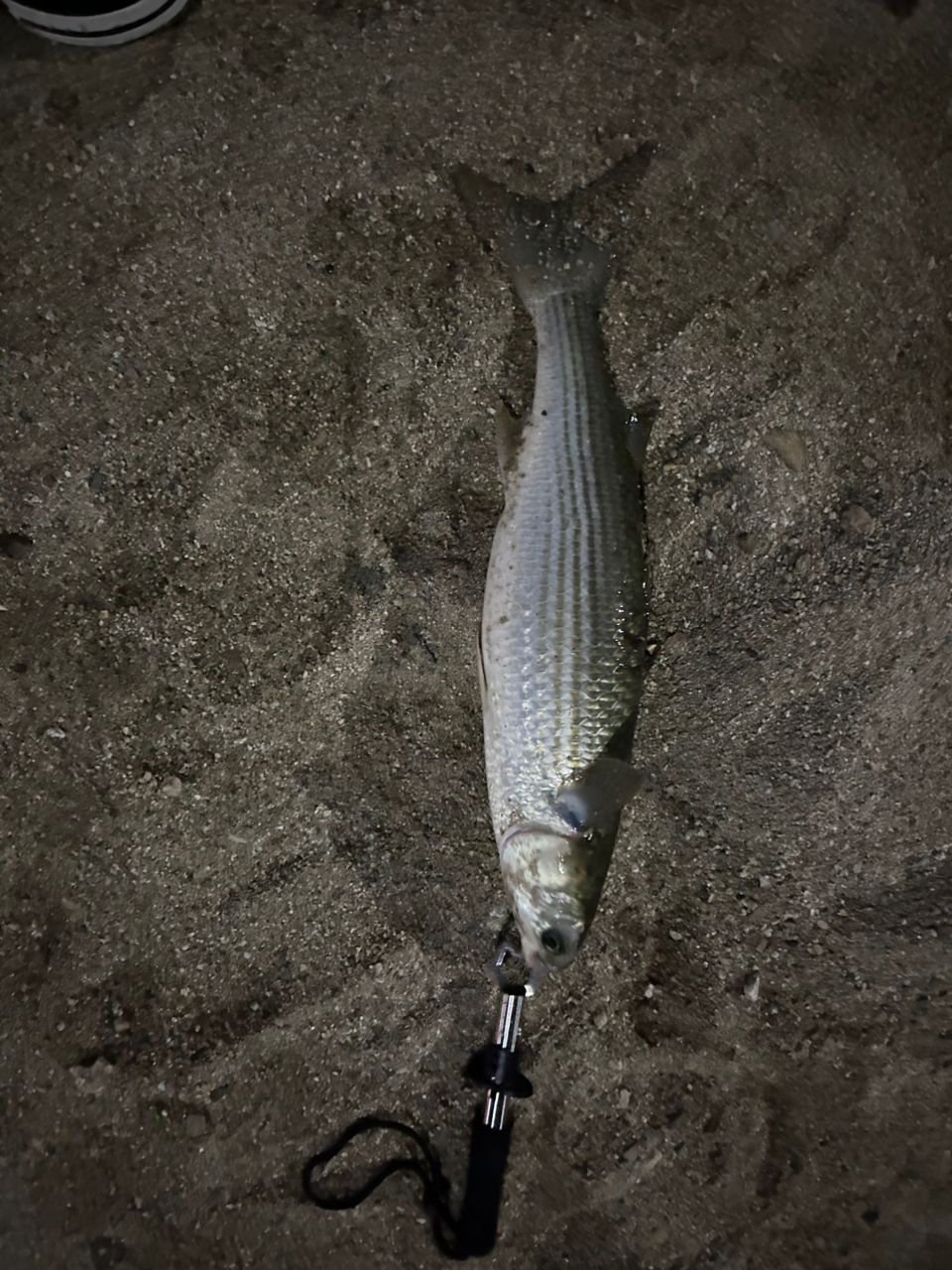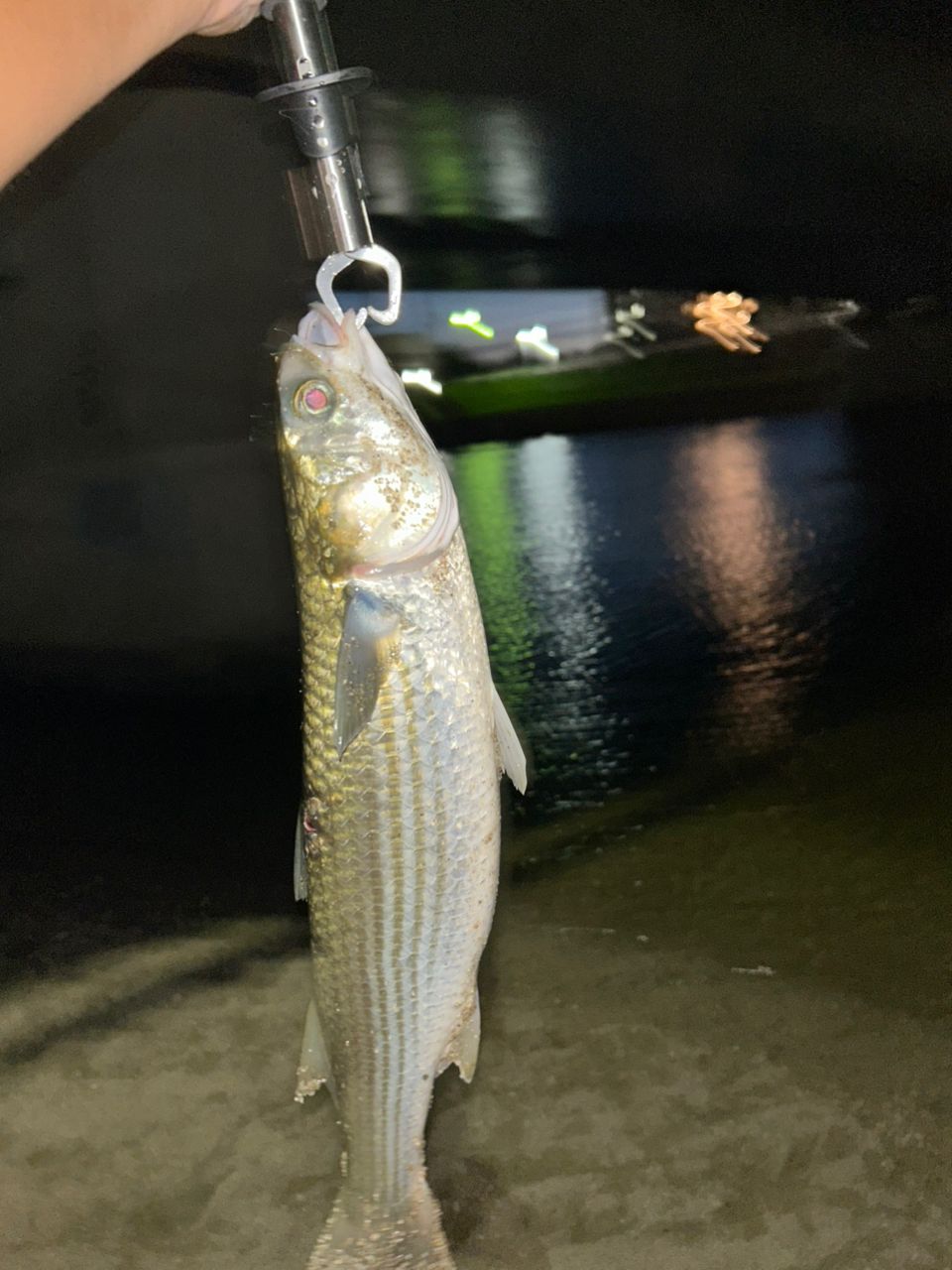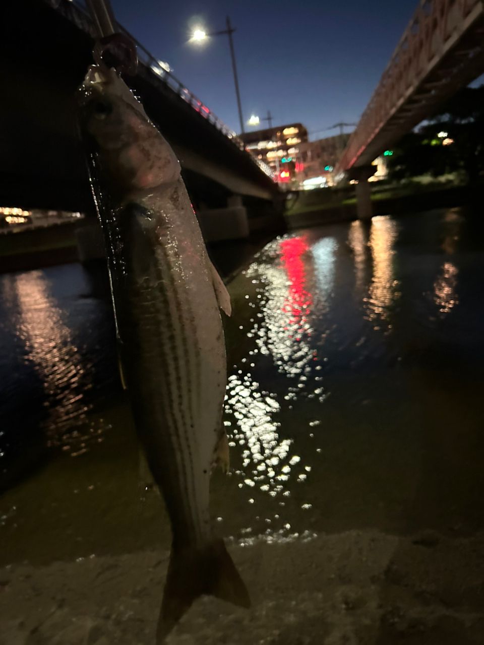 最近河口付近でシーバスが釣れないので流れの変化のある堰付近に移動して、シャローランナーをスロー巻きしているとボラのスレ掛、、、