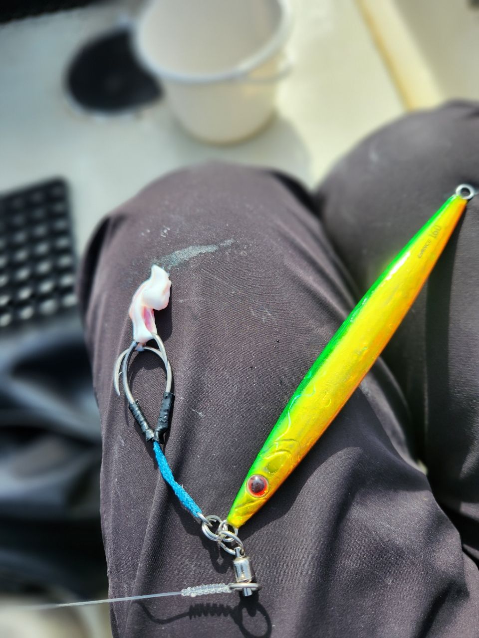 そのジグのまま終了1時間前くらいに着底で根掛かりと思ったらブリで、既に疲労困憊だったのもあり苦戦してやっとキャッチしました。暫く休んでいましたが終了間近になったので(ほどほどのサイズのが釣れないかなぁ)と思いながらやったらまた同じ位のブリが掛かってやっとの思いでネットイン!…の直前にバレました😭唇1枚残して身切れです💋ジグが吹っ飛んでタモを構えていた船長さんに当たりそうになりました⚠️以前船長さんが「ファイト時間が長くなると身切れでバレますよ」と言っていました。これかー😱
