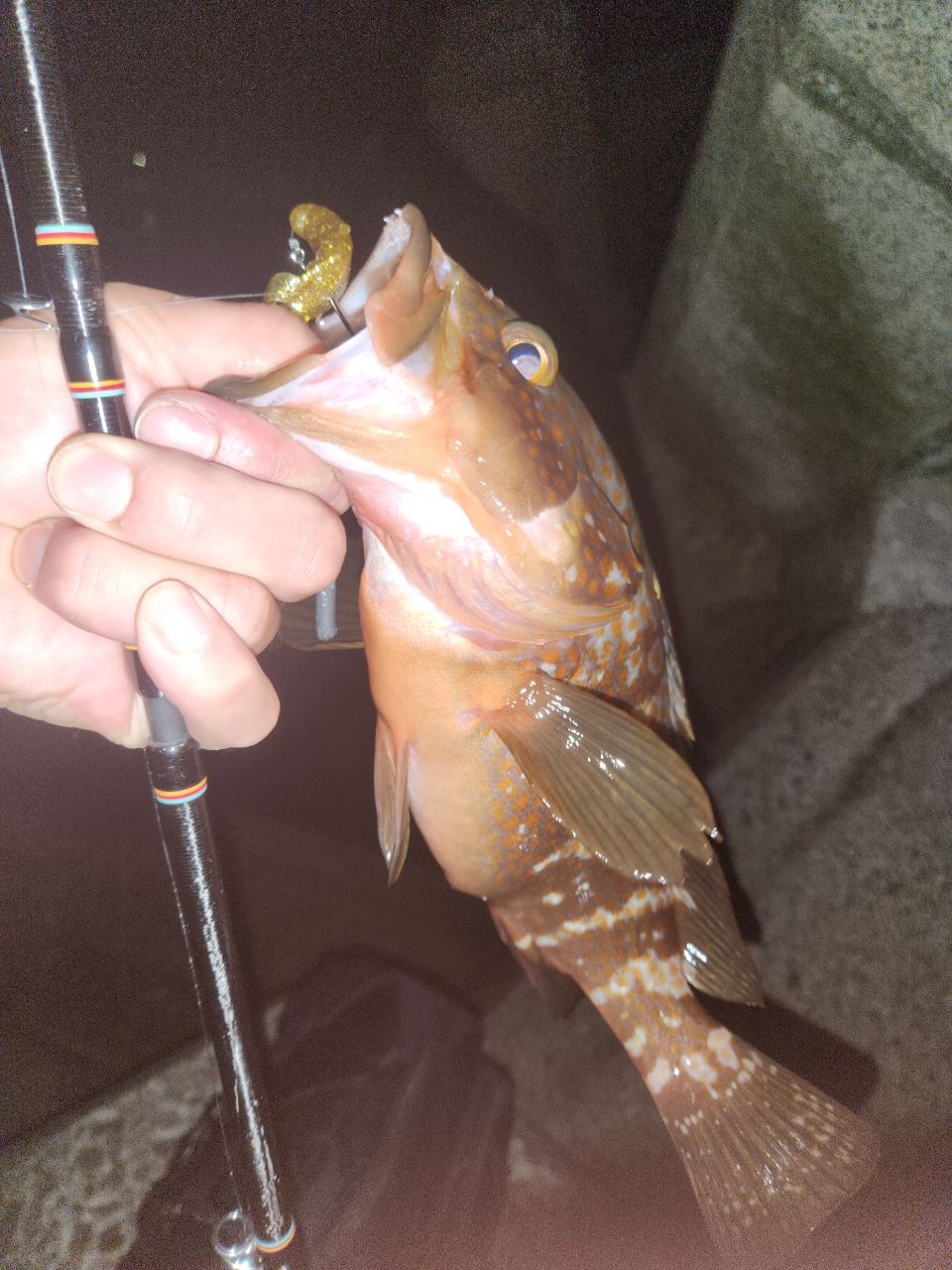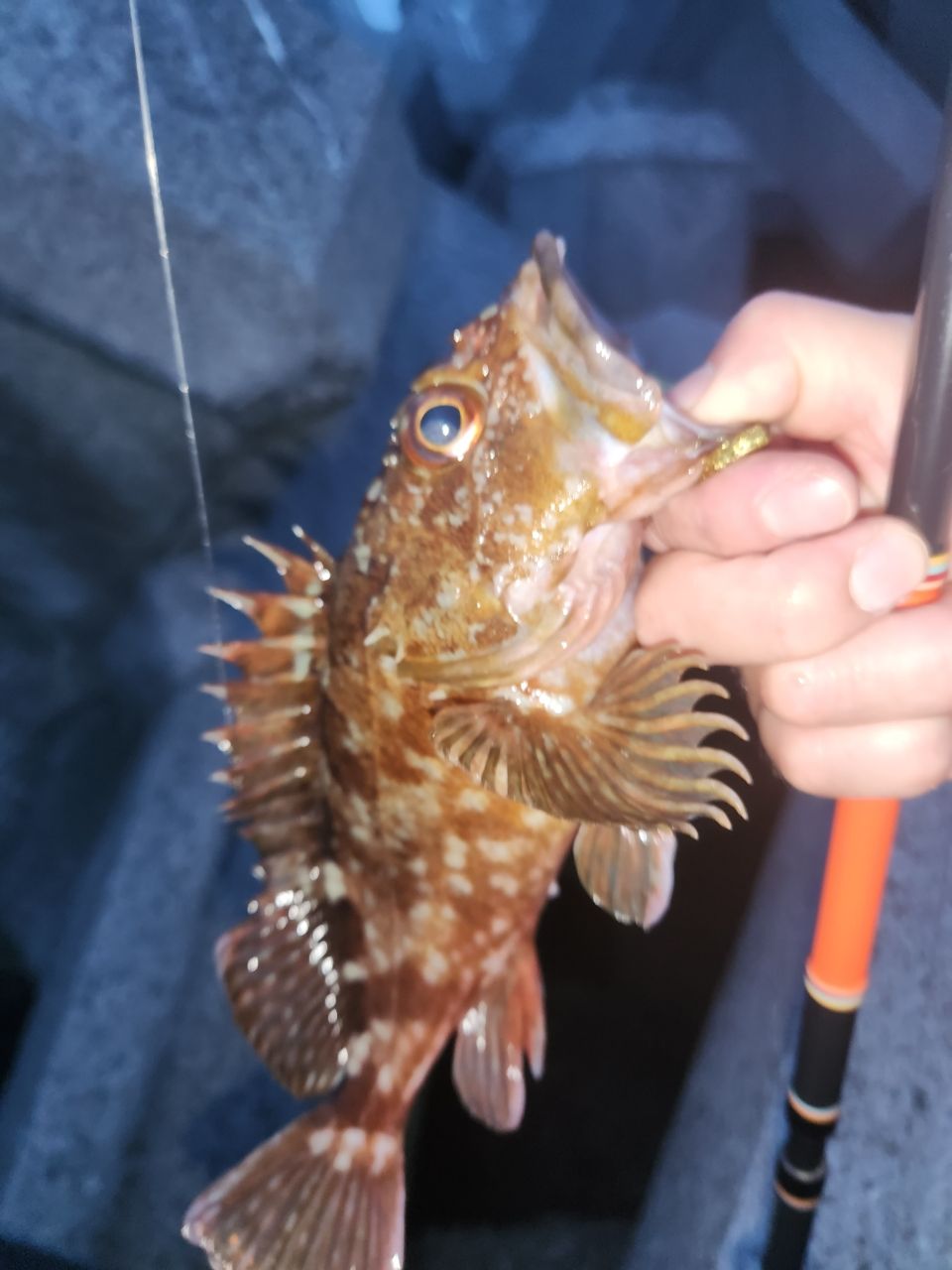 めげずに多数のガシラからの、これ又大きいオコゼ!ホントは持って帰りたかったけど刺さるの怖いから帰って頂きました! 最後に本命のアコウを釣る事が出来、良い感じでしたけど、ゴロゴロとして来たので、慌てて納竿!⚡️ 明日から連休なので晴れた日には出撃したいと思います😊
