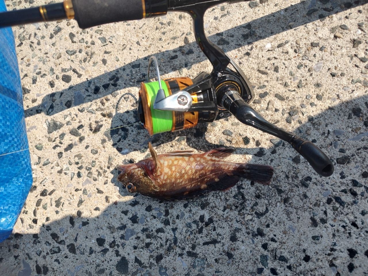 モンゴウイカめっちゃ引きました。胴から口までで大体40センチくらい?あとカサゴもまぁまぁ釣れました。ルアーはisseiの根魚玉5gにガメシャッドグローです。カニは引っ掛けました。