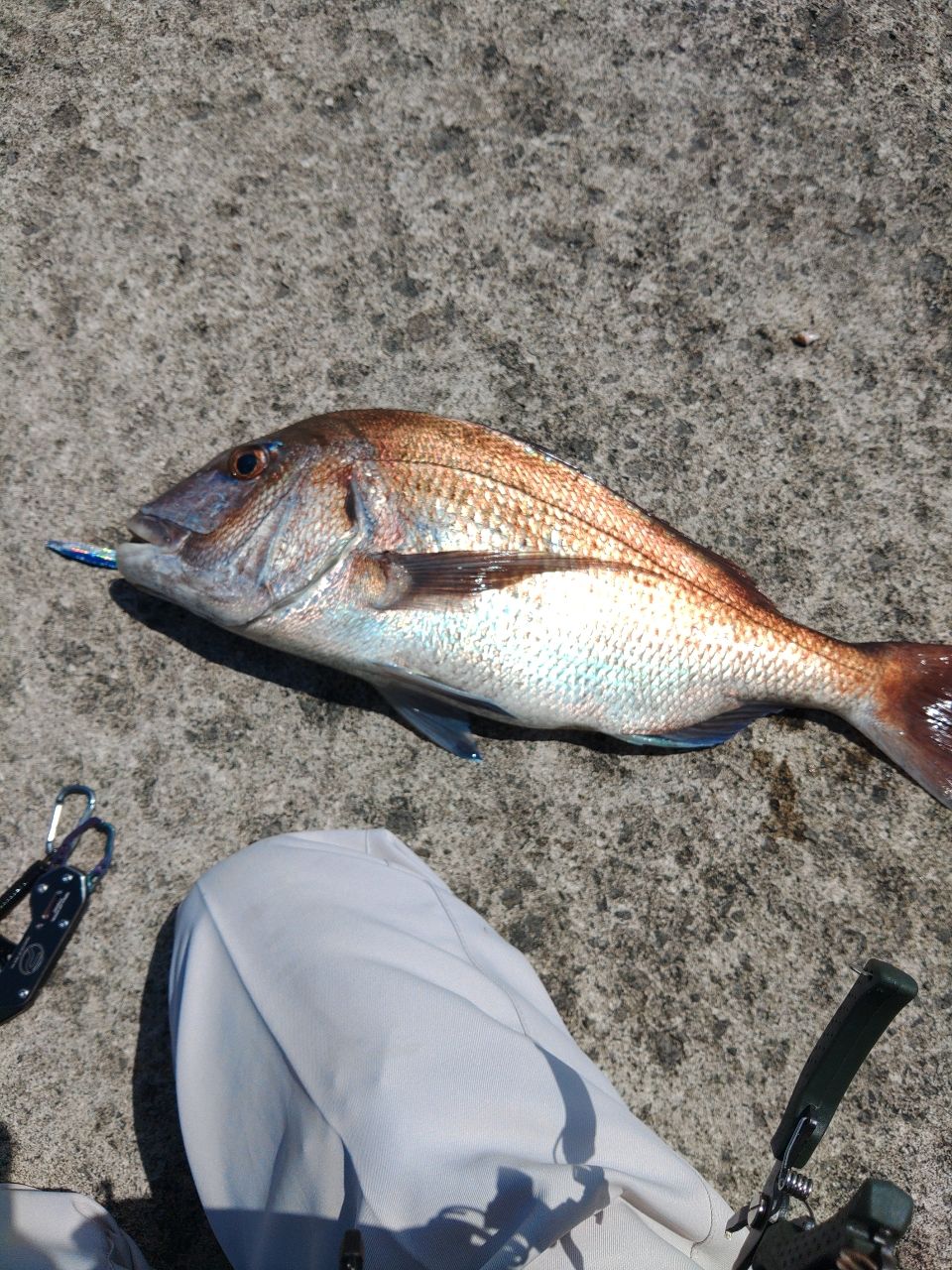 帰り際、ファミリーの方にも同サイズのマダイがヒットしてて、ランディングを手伝いました。