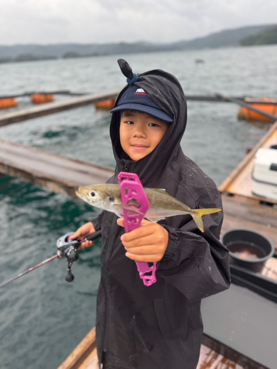 雨で多少濁ったほうがアジは釣れることがある、なんて話を覚えていたのと、雨の中で外遊びするのが冒険的で楽しみなようでした。