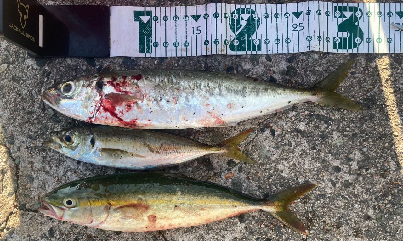 日が昇る前にジグサビキで20cmのアジGET😆…続かない🥺日が昇ってツバス2匹抜き上げポロリ🥺うーん、今日は駄目な日だ😒ちょっと暑くなってきたので心が折れかけていたらフォール中にヒットで尺アジGET😆