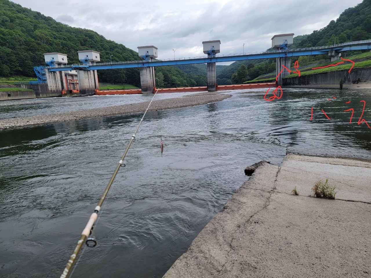 - 石狩川中流で釣り開始