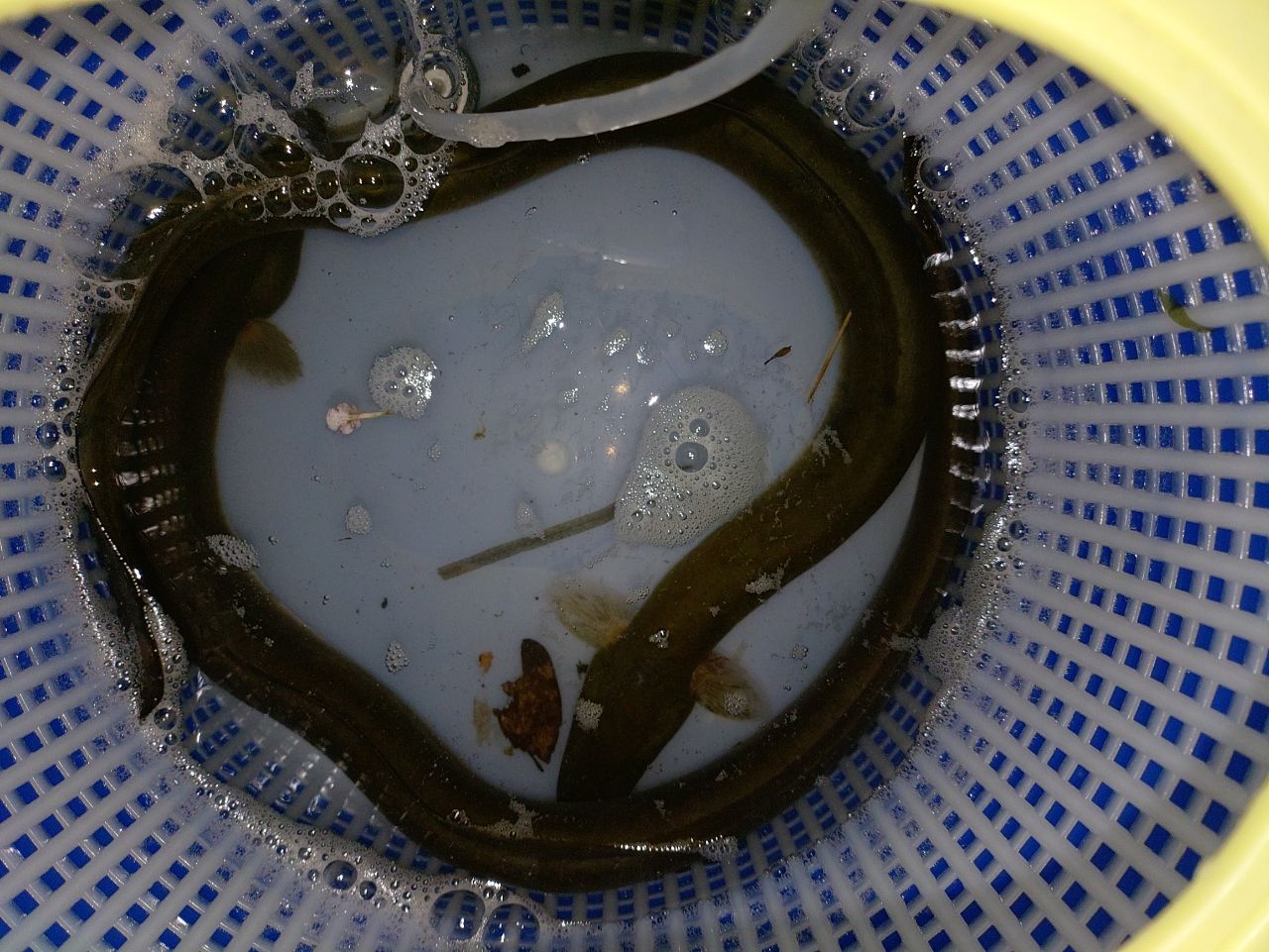 8/16 夏休み終了前に、深夜までやるつもりでウナギ。いい感じに濁りはあるけどゴミが多くて釣りにくかった。2時半まで粘って良型2本。