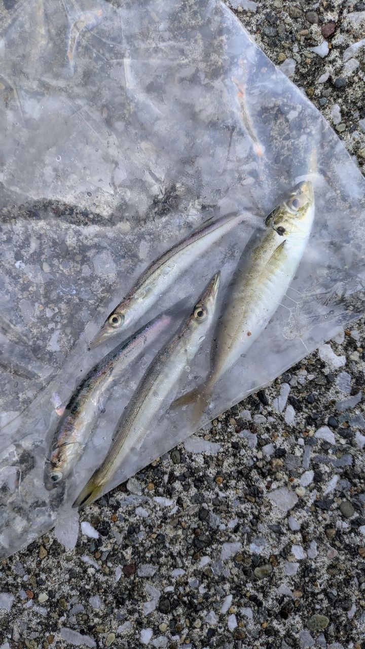 6:00〜8:00 ①チビアジ×1 ②チビカマス×2 ③カタクチイワシ×1 さすがに少な過ぎるので、スーパーで魚を追加してから南蛮漬けに。