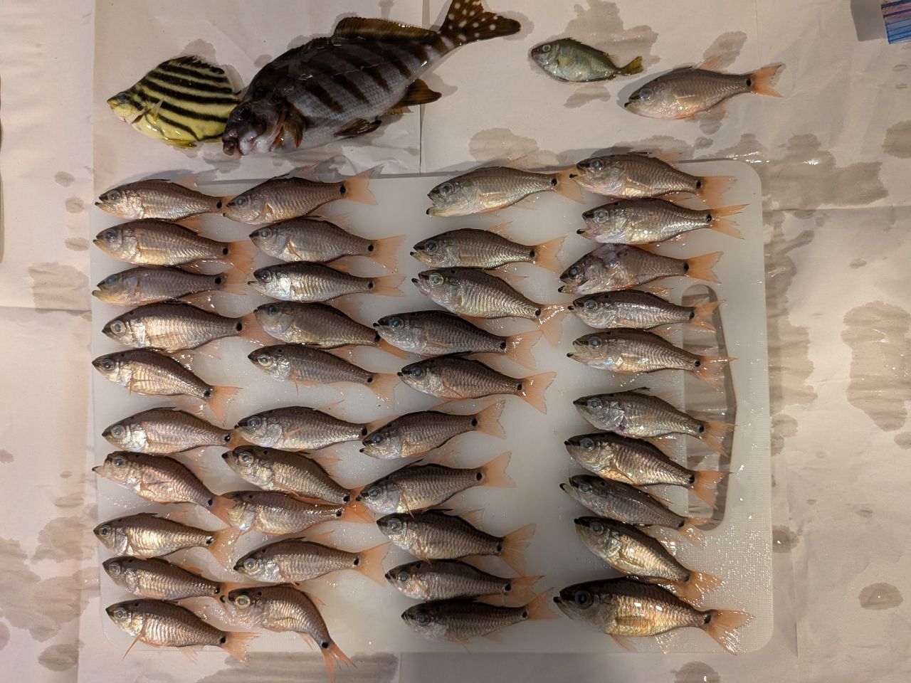 ネンブツダイ41,タカノハダイ1、ソラスズメダイ1(軽い毒があるのでリリース)、カゴカキダイ1,アイゴ1、よく分からん貝1