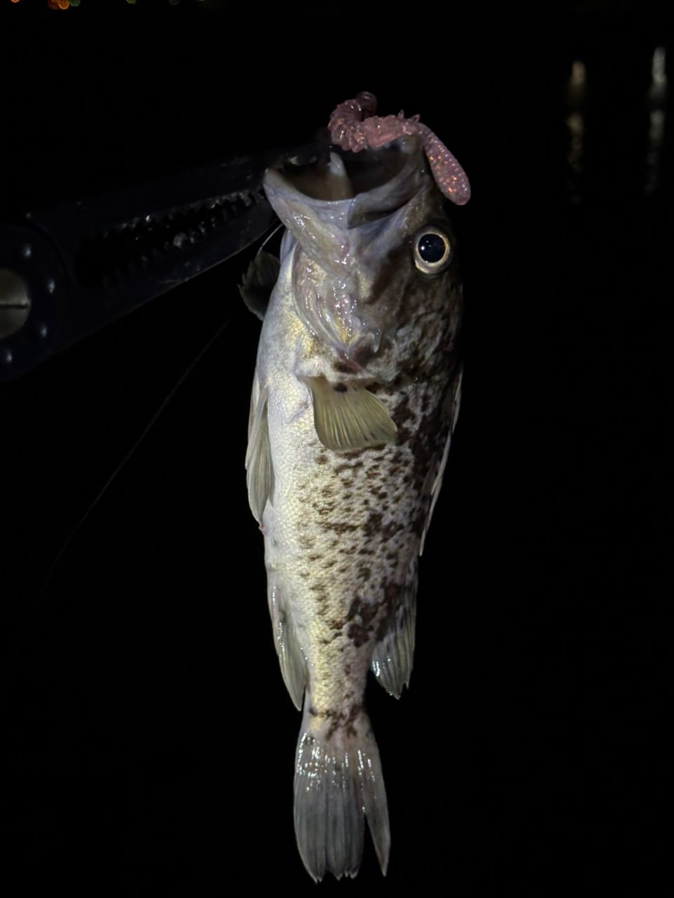 ファーストバイトがカラスの死体でフックを外すのに30分くらいかかる不穏なスタートでしたが、気を取り直し場所変えをして、ボトムにある根をすり抜けてフォールした時にバイトしてくれましたー!