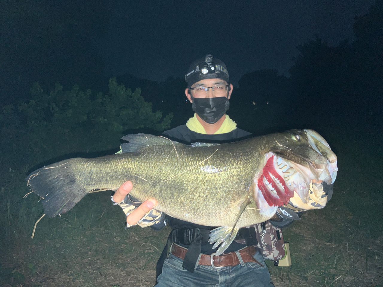 昨夜も琵琶湖。土曜日出勤だった事もあり中途半端な時間の22時過ぎに到着。入ろうと思っていたポイントに先行者あり。よく見ると僕の兄でした😅。聞くと1時間前くらいからやっているが全くのノーバイトとの事。21時ならギリ時合いか時合いをちょっと過ぎたかな?というタイミング。そこで僕の兄がノーバイトならこのポイントは今日は絶対アカン日やな…と少し離れてピンのポイントへ。ここは基本的に釣れないが、なぜか居たら必ずデカいやつが釣れるトレースコースがありそこ一択狙いで実績のあるキンクー5.8霞ジンゴロームを投入。ゆっくりとウィードに絡ませながらミドストしてくると、先ずウィードに引っかかる。それをフワッと外した瞬間にまたズシッと引っかかったような重み。ん?🙄