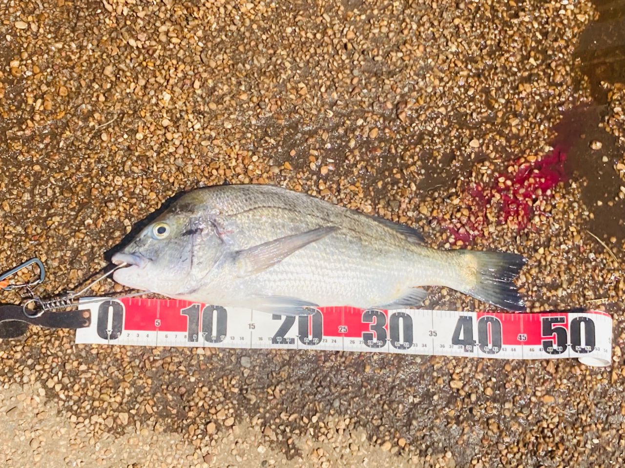 再度、養老川臨海公園へ土日を避けてキス釣査 朝7時ごろに到着 釣り人はポツポツ いつもの釣り座が空いてたのでお隣りさんに挨拶して釣り開始 サーフ遠投用30-405に錘25号、市販のキスハリ7号3本にアオイソメ 2投目いきなりトリプル(写真2)今日は爆釣?と思いきやそこからペースダウンするもポツポツ釣れます しばらくするとお隣りさんの竿が大きく曲がります 「マゴチかな?」「いやチヌだ!」タモ入れをお手伝いして無事にネットイン 46cmの立派なおチヌさま(写真3)お隣りさんは持って帰らないそうでありがたくいただきました🙇 釣果はキス18匹(プラスお隣りさんから1匹) サイズは14〜19.5cm 前回とほぼ同じ 10時過ぎたらアタリも減って11時過ぎに納竿