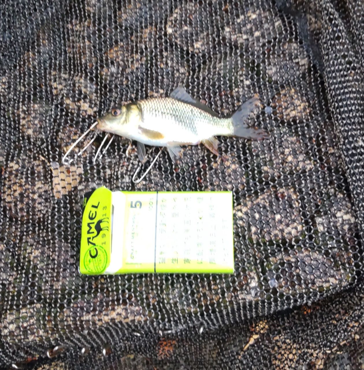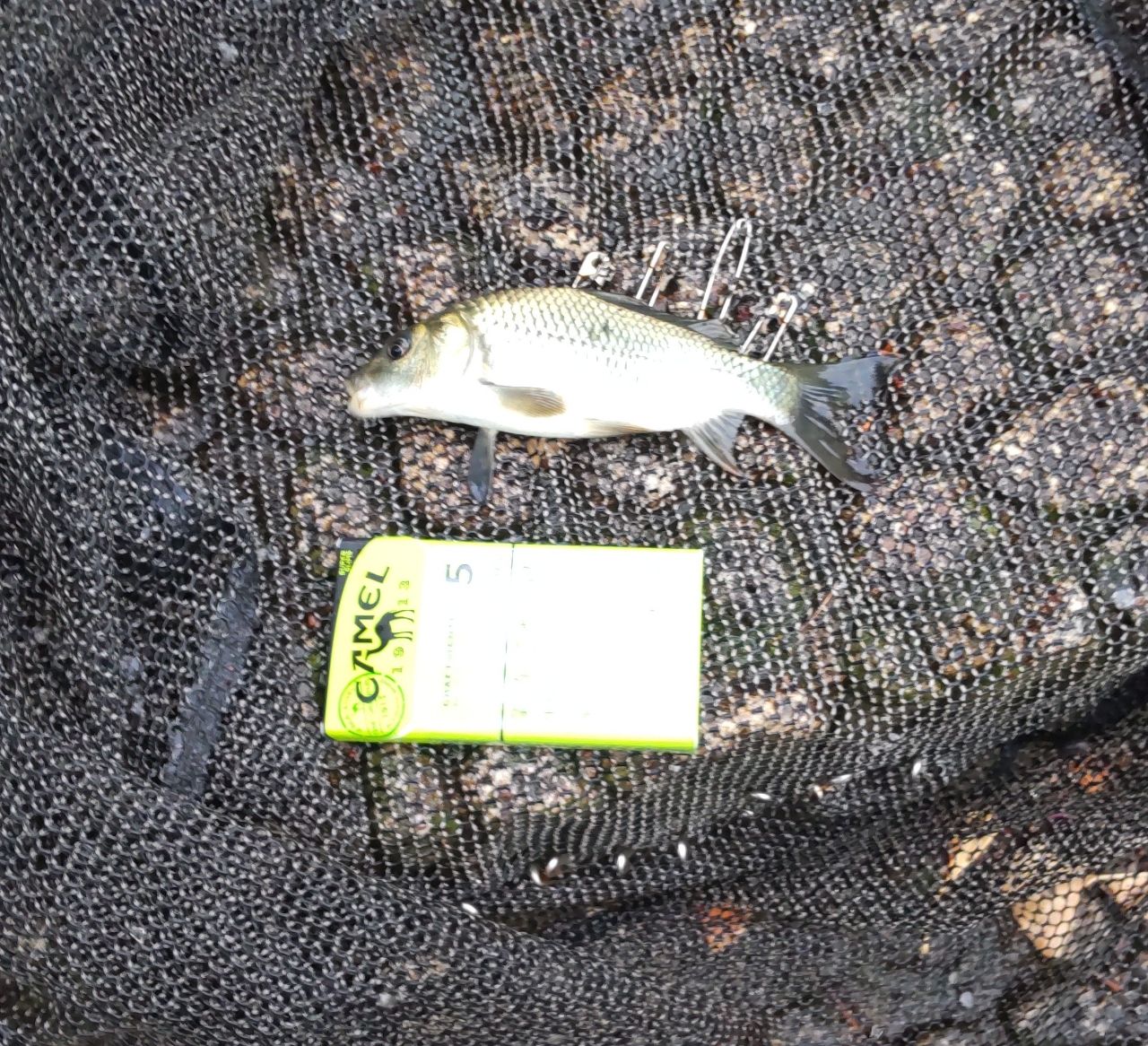 練り餌をにぎにぎする時間もないのでナマズ狙いでナマズ爆弾投下💣️リンリン→ちっちゃいコイ😂リンリンリンリン→うおー、柵の辺なとこにラインが絡まりバラし😱リン、リン🤔これいる?1匹目よりさらに小さいコイ追加して納竿です🎣