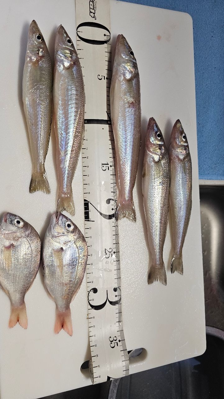 13時から16時頃まででアオリイカを…狙いましたが。海がざわめき表層でボラやらダツ(ジグサビキで確認釣り上げたので)等が飛び跳ねていたのでアオリイカを諦め。キスを狙いましたが…浅場では無く、深場でピンキスとチャリ子を数匹…一旦撤収して。
