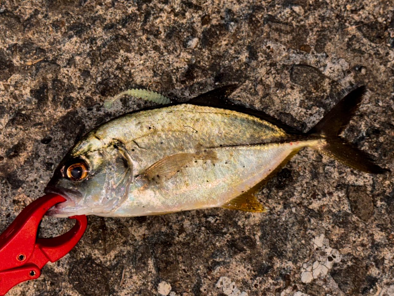 で、上がってきたんはアジはアジでもメッキさんでした😅