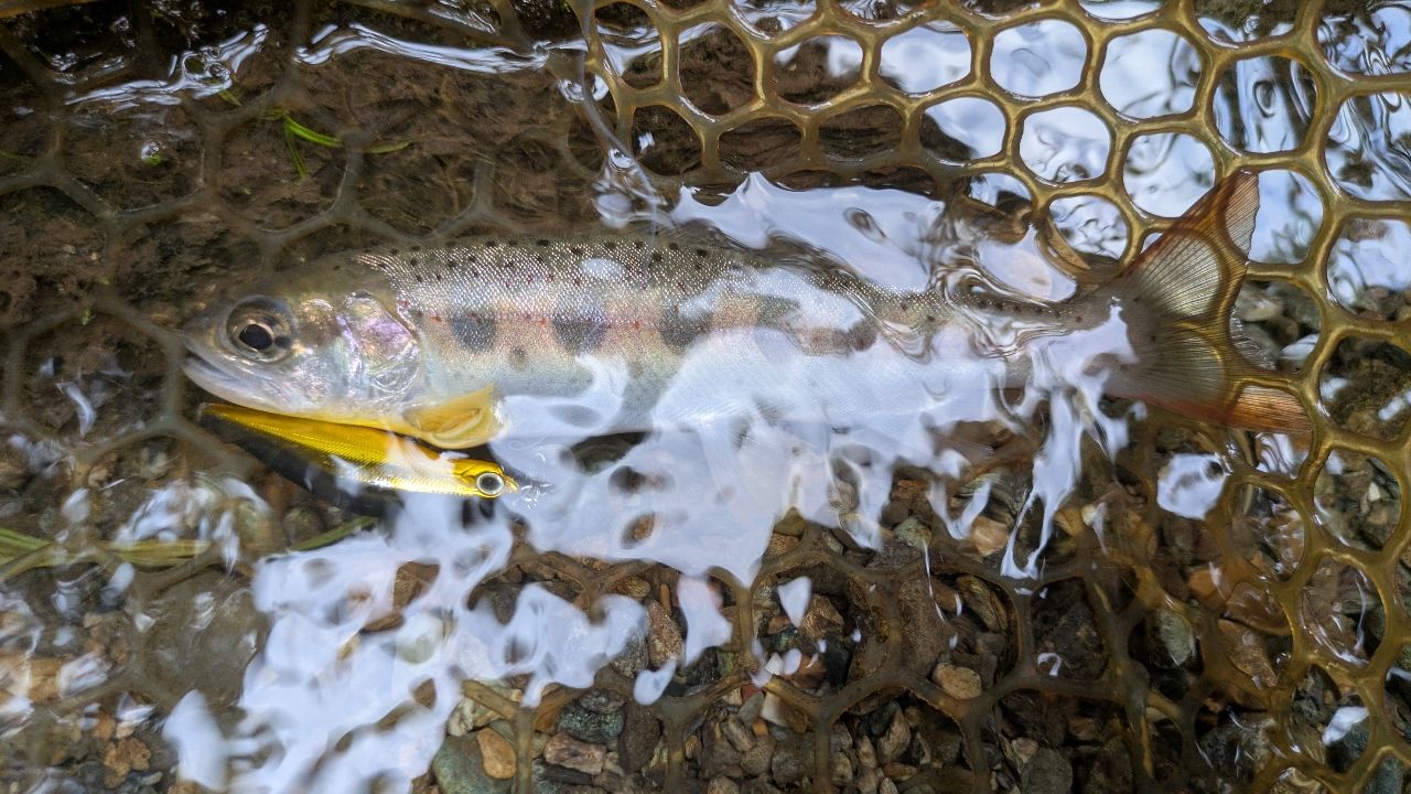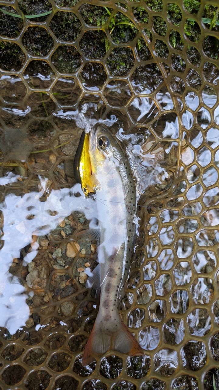 ルアーで渓流2回目で可愛いアマゴちゃんが釣れてくれた。久しぶりにオッシャー!て叫びました。