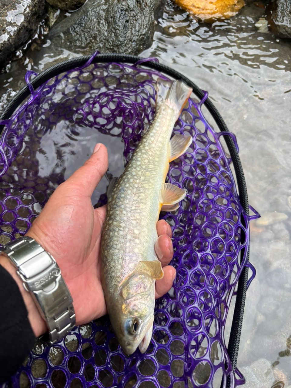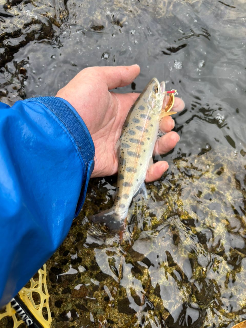 本流ヤマメ(小)。イワナ含め釣れる魚体が綺麗な川だった