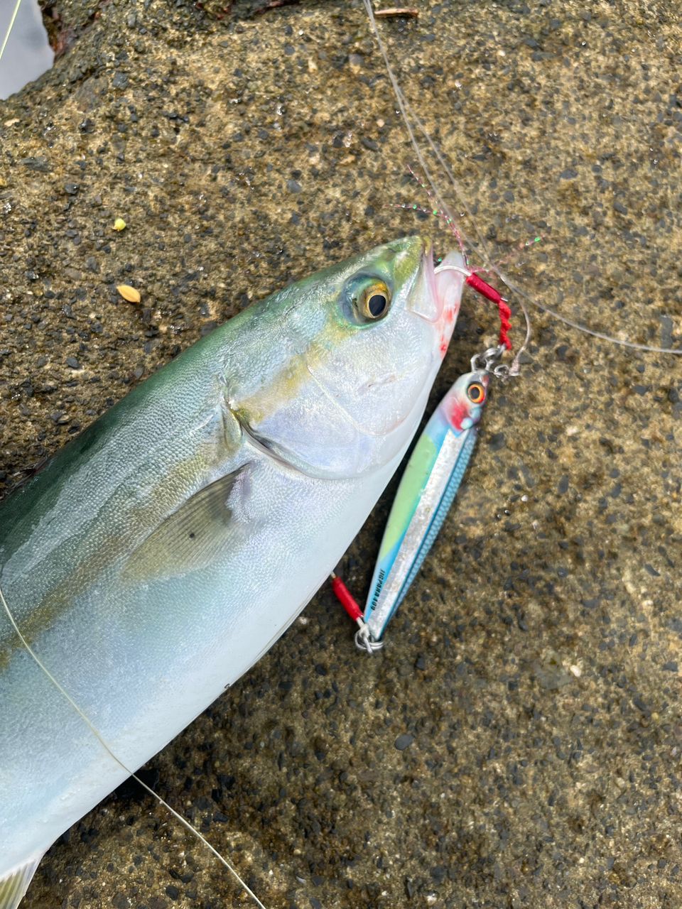 小魚が追われている様子が見えたのでジグを投げるとツバスがヒット。
