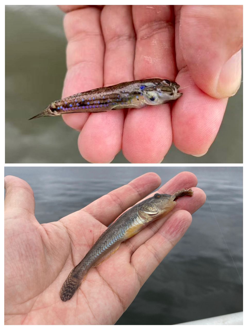 結果は、養老川ではシロギス×3、木更津ではハゼ×5。写真2枚目上段は体側の青い斑点がキレいな”ツマグロスジハゼ”(返)。