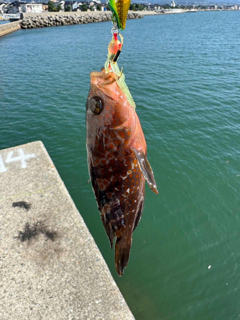 2匹目、キジハタ釣り上げるが写真を撮る前に跳ねて海へ😱