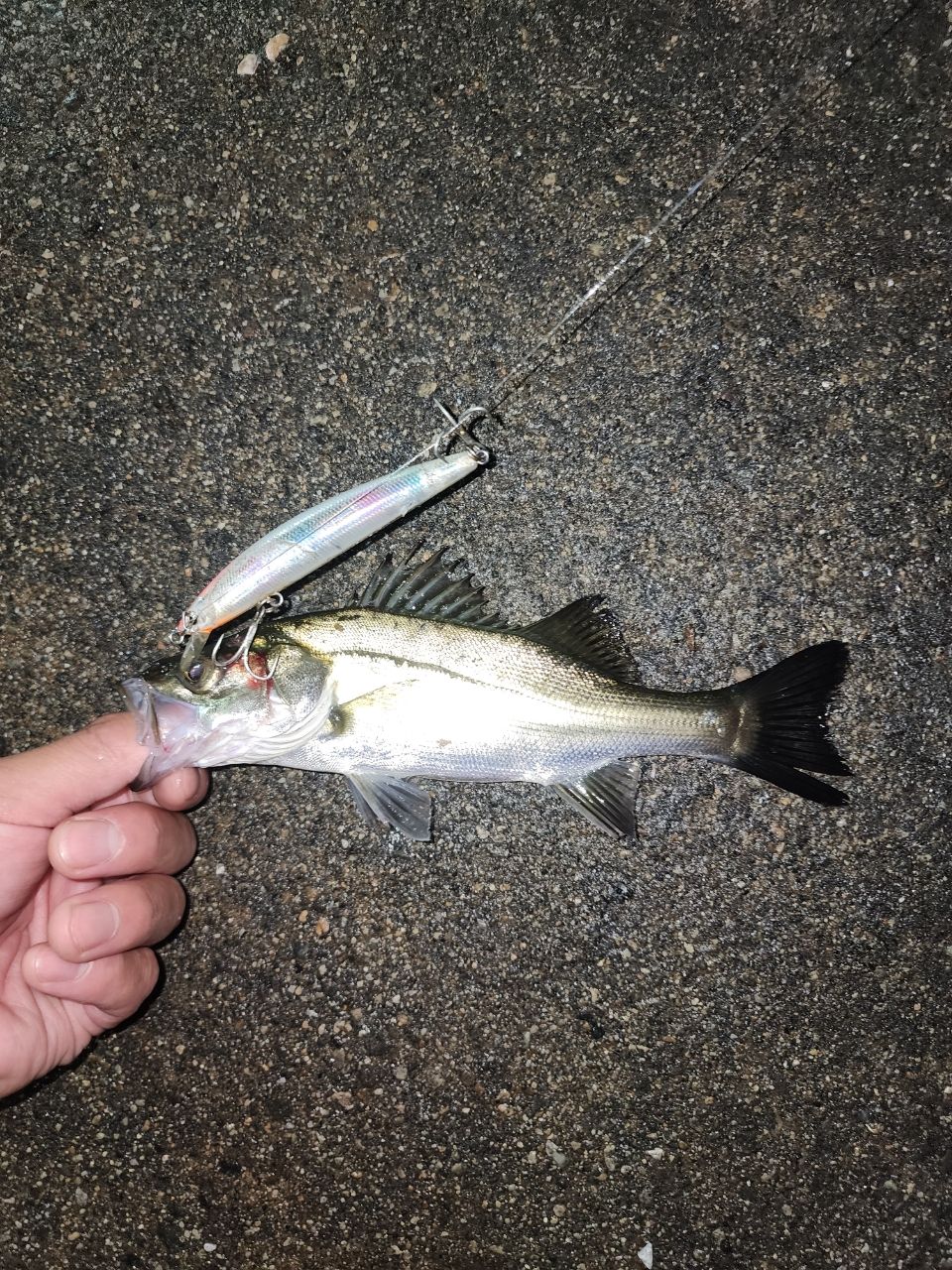 何だろうと目を凝らし見てるとビッグベイトが頭にくっついたシーバス!!