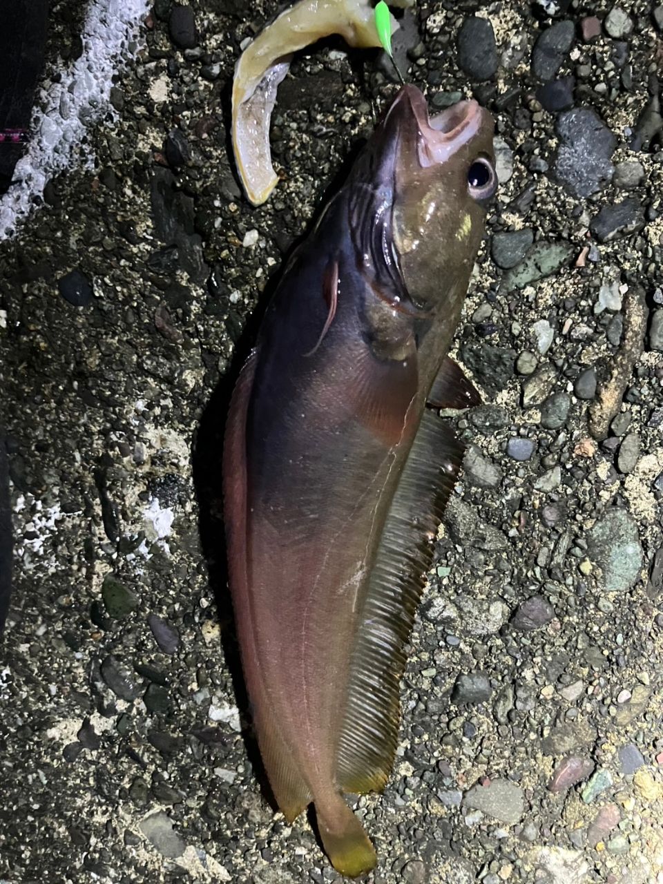 午前1時到着。うげ、水が真っ黄色!でも魚影がある⋯イカも泳いでる!で、竿を早速出してみるも⋯釣れたのは小サバとヌメヌメくん。サイズが微妙だったのでお帰りいただく。