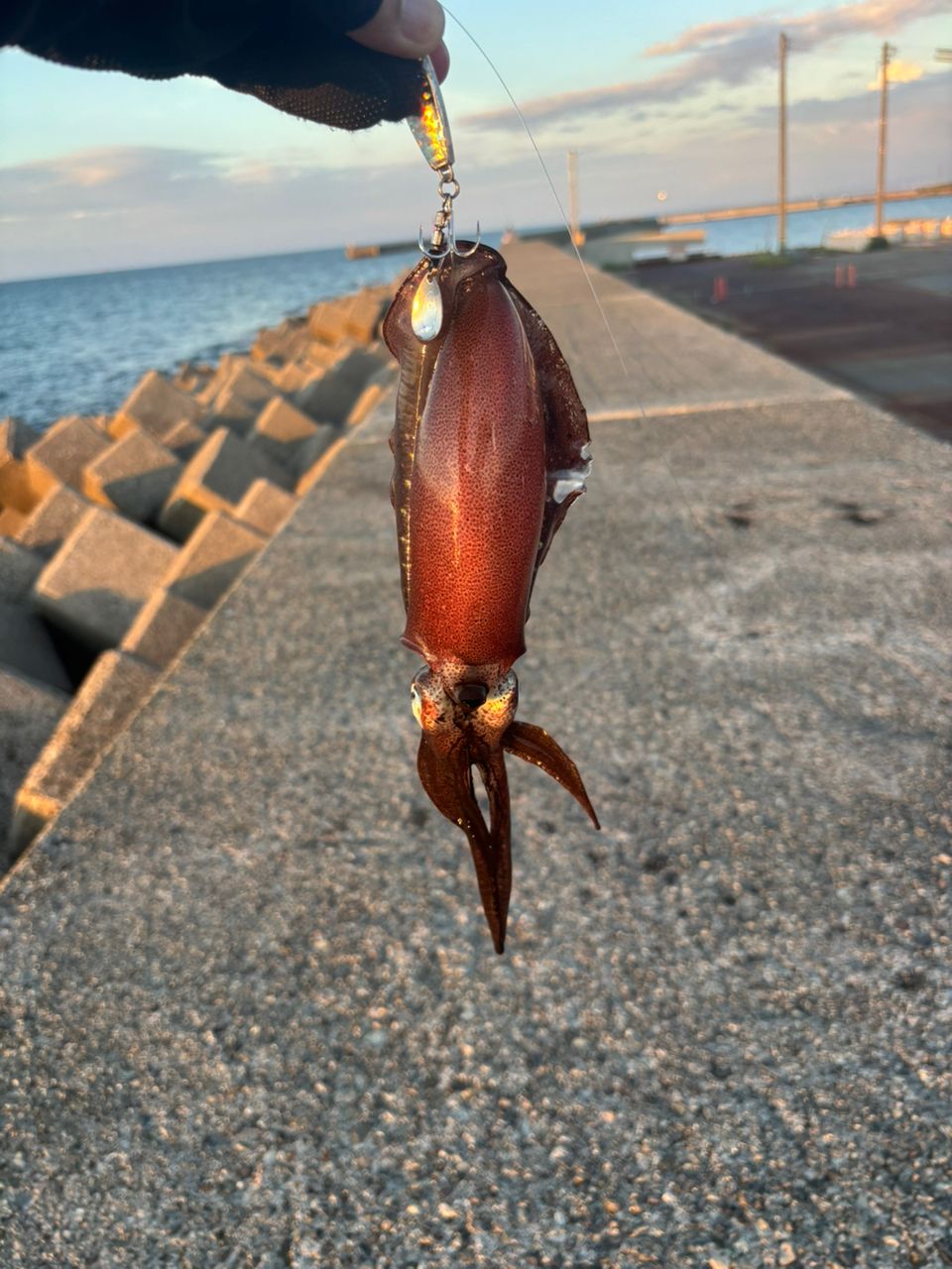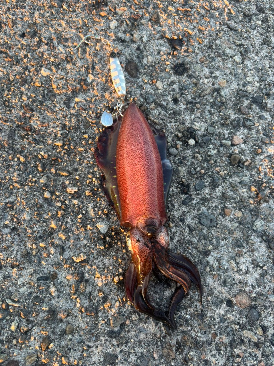 風が強かったので、今日はショアジギしてみたらイカ釣れた笑
