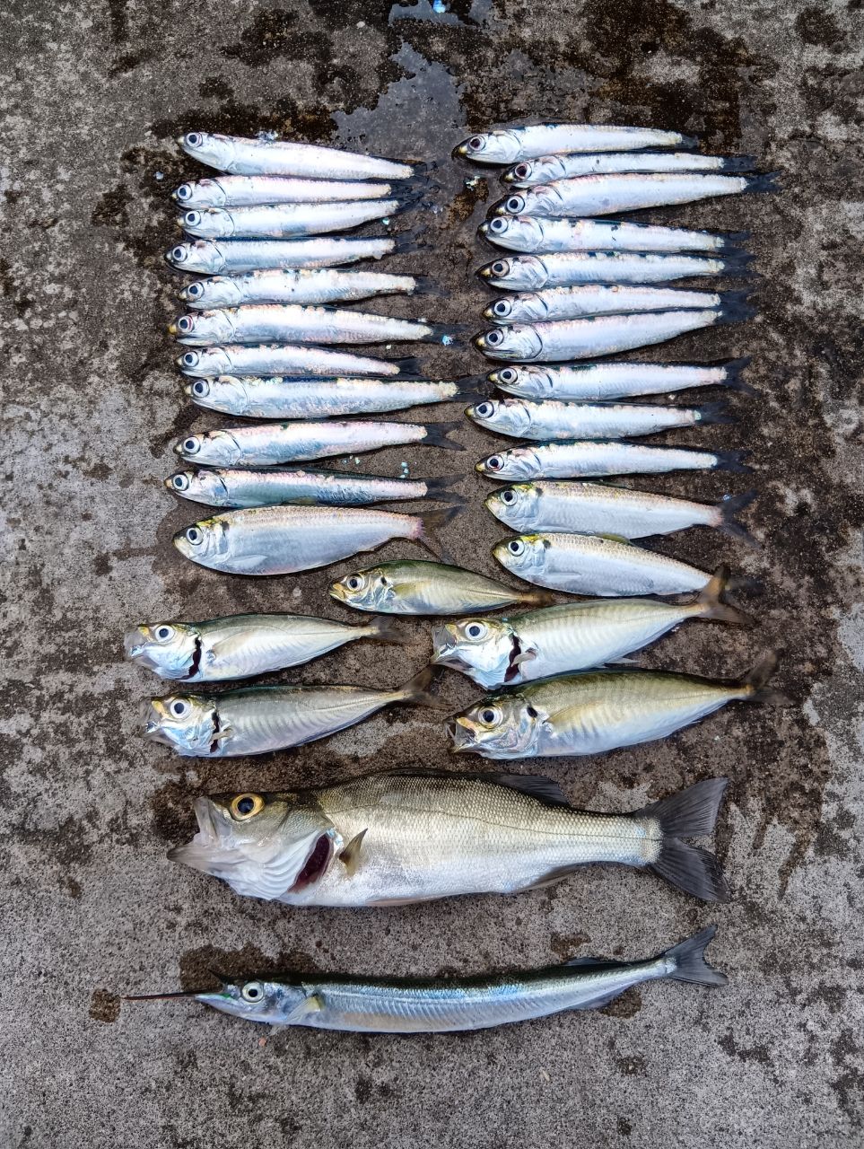 釣果サヨリ1、セイゴ1、豆アジ5、サッパ3、カタクチイワシ20。初の五目釣り達成でした。