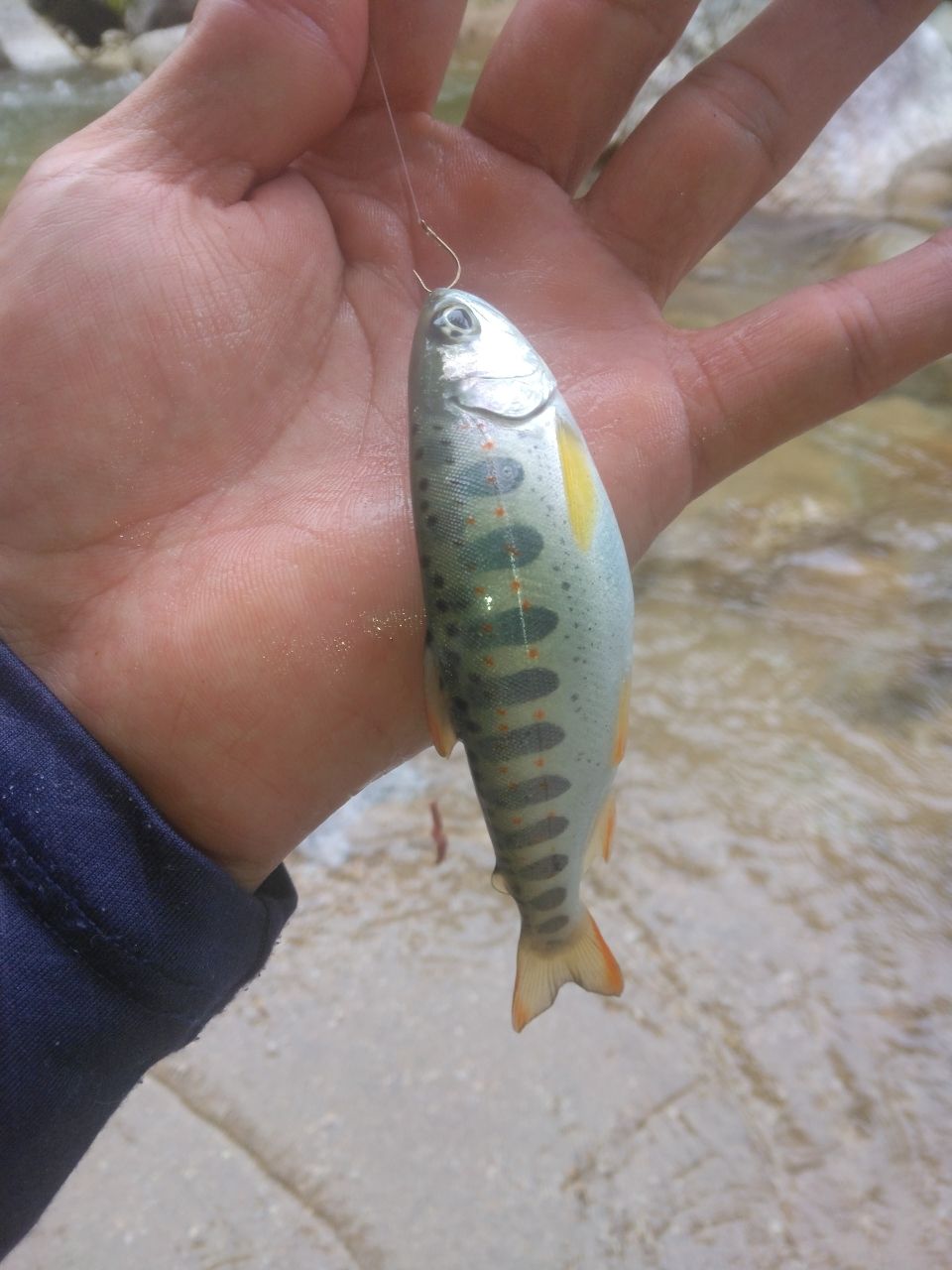 遊漁券を購入して釣り場に到着し、釣りを開始すると、小さいアタリがあり、13㎝のアマゴが釣れました。