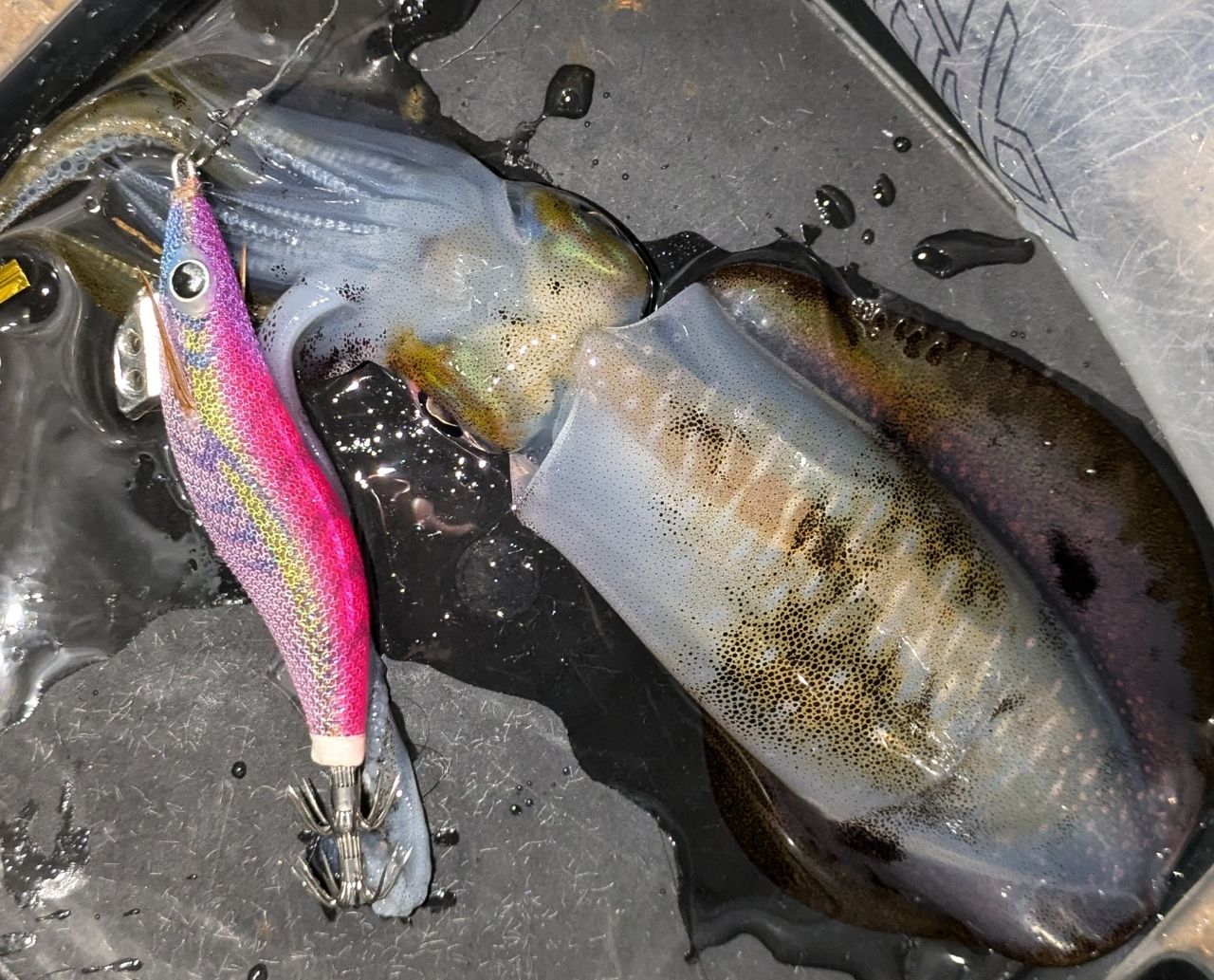 釣り場でイカ墨が目立ってきたので何でもいいからイカが釣れないかと思い、とある動画で見た誘い方を試してみることに。せっかくなので、よく釣れると聞いたムラムラチェリーで動画の通りにエギをしゃくってさびいてみたところヒット!!