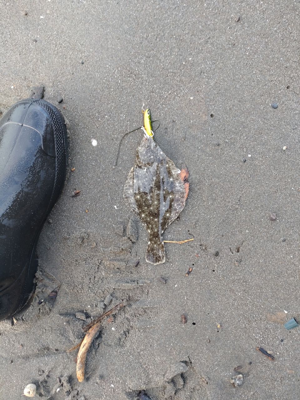 対岸には、うっすら富士山が見え、ベイトもあちこちでパシャパシャ跳ねており、爆釣決定と思いきや、終わってみれば、フリッパーの偽物『偽っぱー20グラム グリーンゴールド』で釣れたソゲちゃん一匹のみ😭