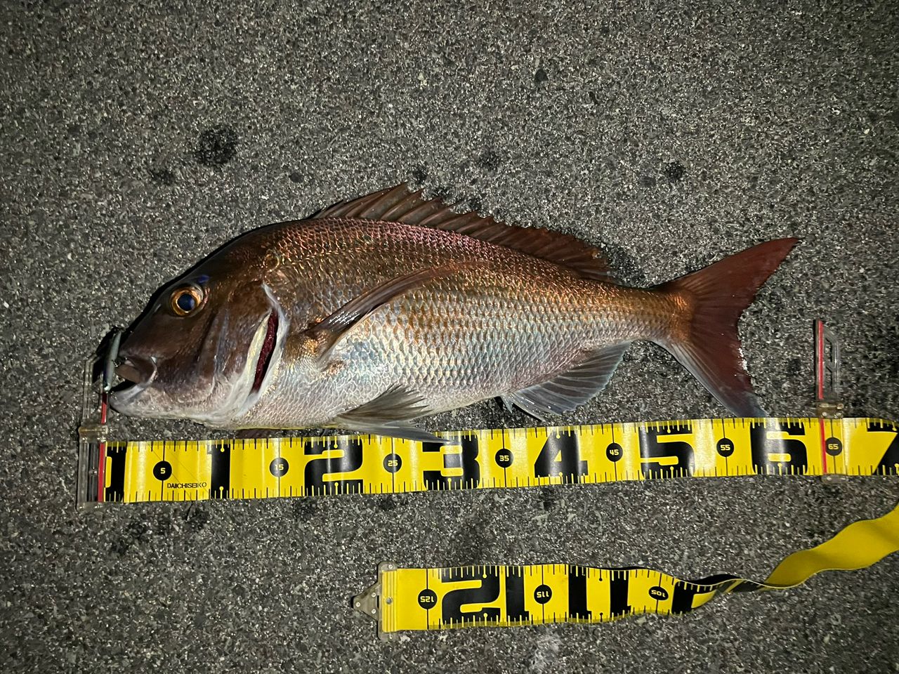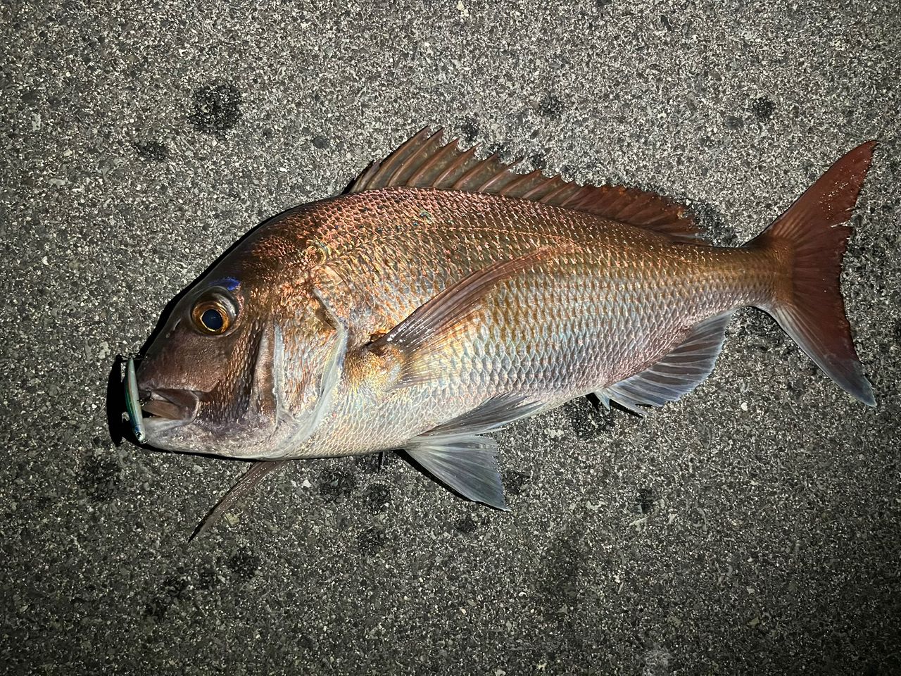 家の前に大量のキビナゴが接岸してて、なかなか食わせられなかったけど、良型マダイがウロウロしてたんで、サイトで狙うとヒット!メバルタックルだったんでヒヤヒヤしながらファイトしました。