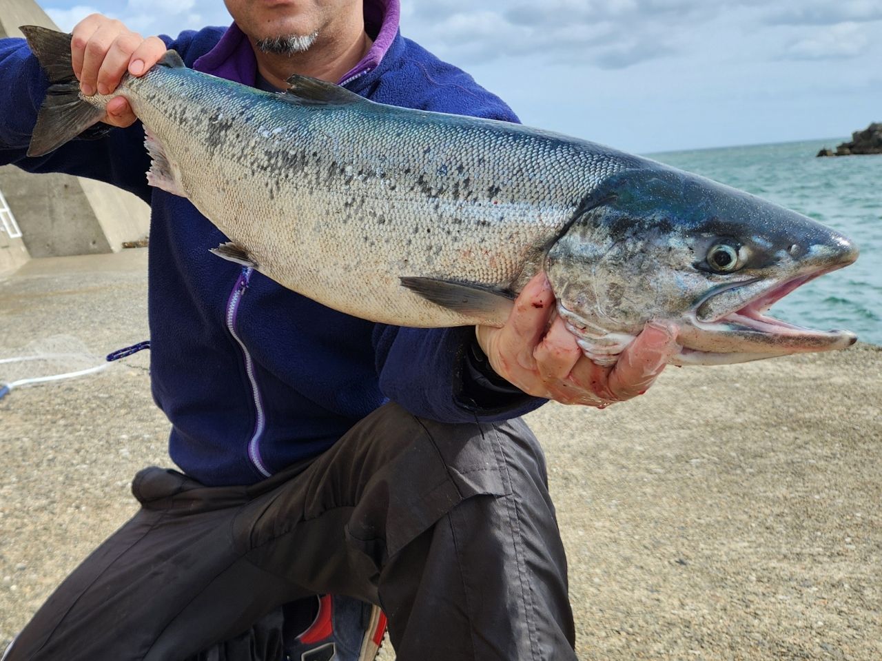 オヤジにタモを任せ、無事ランディング成功👍✨元気なオスの鮭 72cm✨