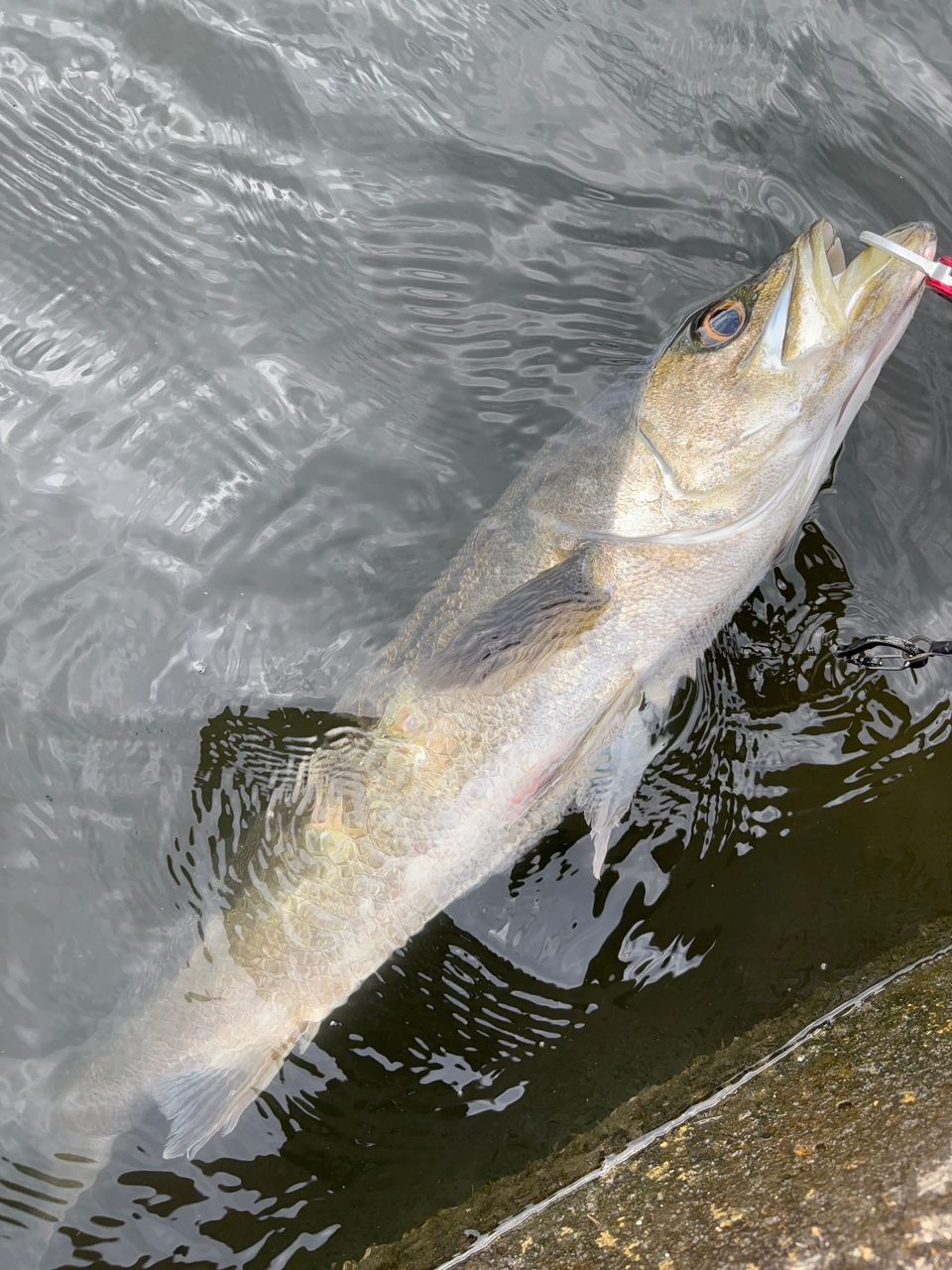 先週の片目が失明していたのとは別の個体ですがこの魚も片目がありませんでした。さらにこのすぐあとに足元を泳いでいった50センチくらいのシーバスも目の辺りにケガをしていました。