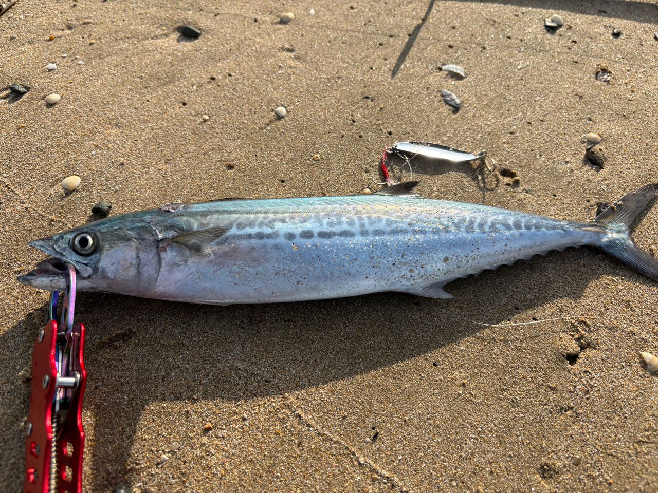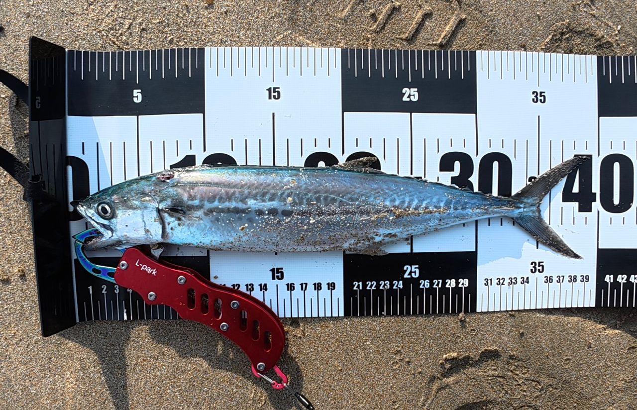 初のサゴシです!離岸流っぽい場所、手前でベイトが出たところに、モアシルダを投げて表層を早巻き🌀スレがかりだったけど「こんなに引くのか!」とビックリしました😳トレブルフック1つじゃ物足りないと思って、ダイソーのシングルフックを付けといて良かった〜🏖️サゴシ釣りにハマりそうです🐟