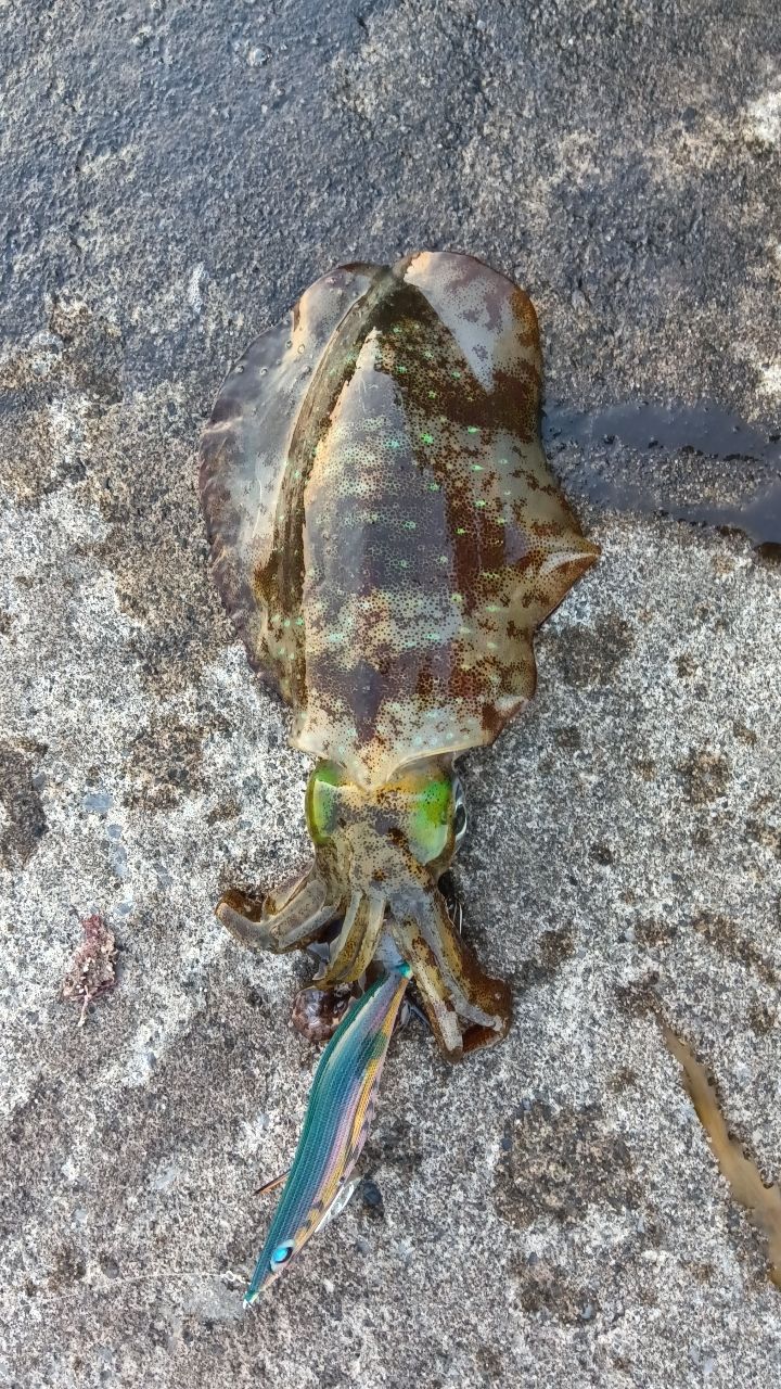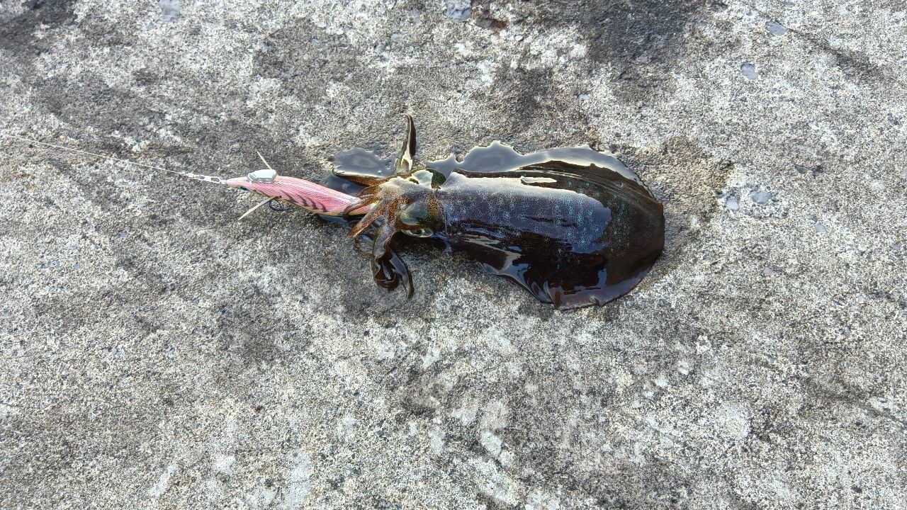 最初は、磯場で始めましたが私には難しく、エギを2個ロストして防波堤に移動、始めての場所で何回も海藻に引っ掛けそこでもエギを3個ロストして諦めかけていたところに1杯目それから30分くらいして2杯目が釣れました。