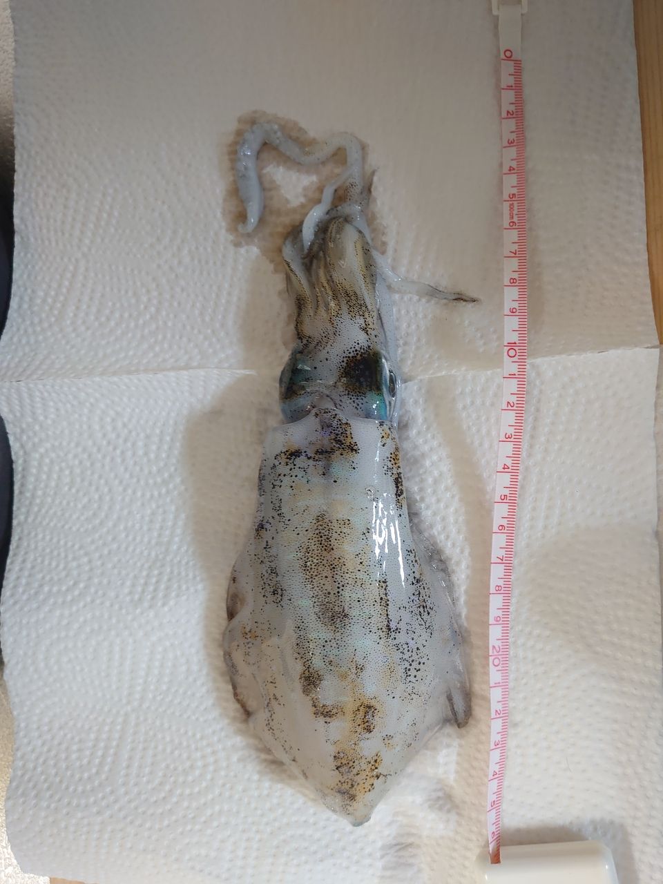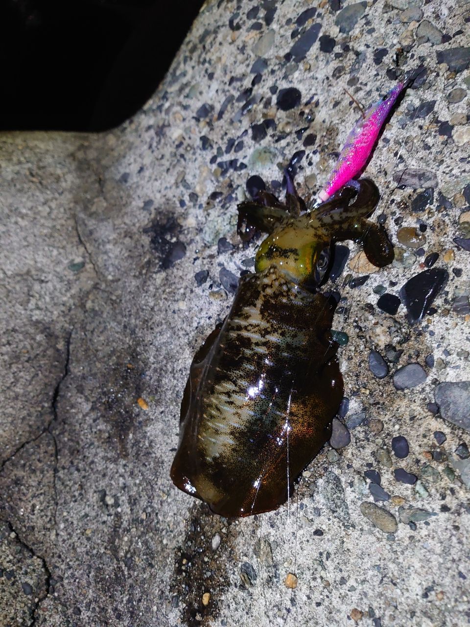 東港の陸っぱりからの釣果です。胴長約15cmの中型サイズ。日中が釣れなくなってきましたので、最近はナイトゲームをやってます。やっぱり光に集まってくるようなので、常夜灯があるところで釣るのがおすすめです。ちなみにエギは2.5号で