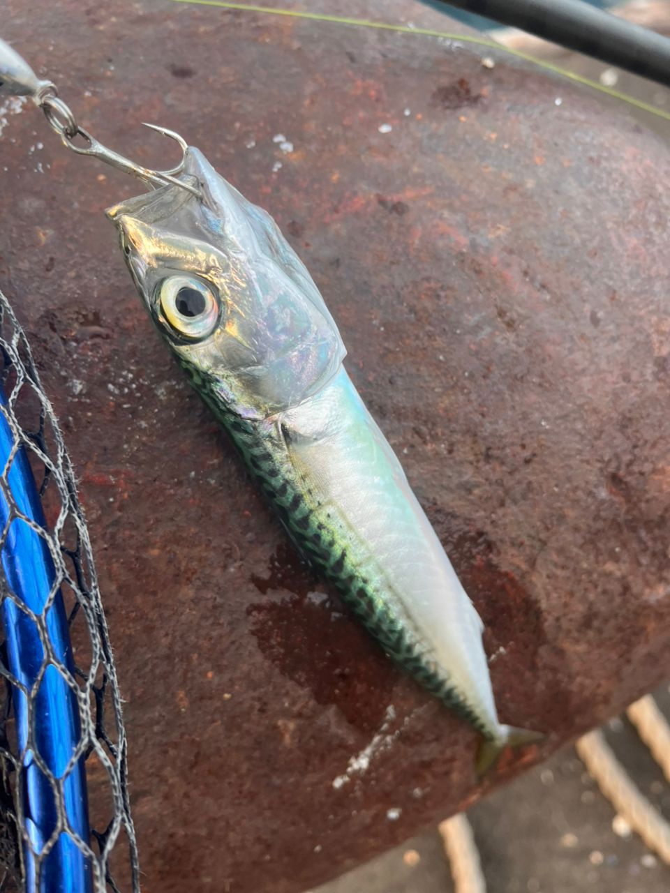 人も少ない 空いてるスペースでちょっとだけ青物狙い イワシ?パシャパシャで小サバがヒット❗️ その後ちょい大きめサイズのこれまたサバ😂