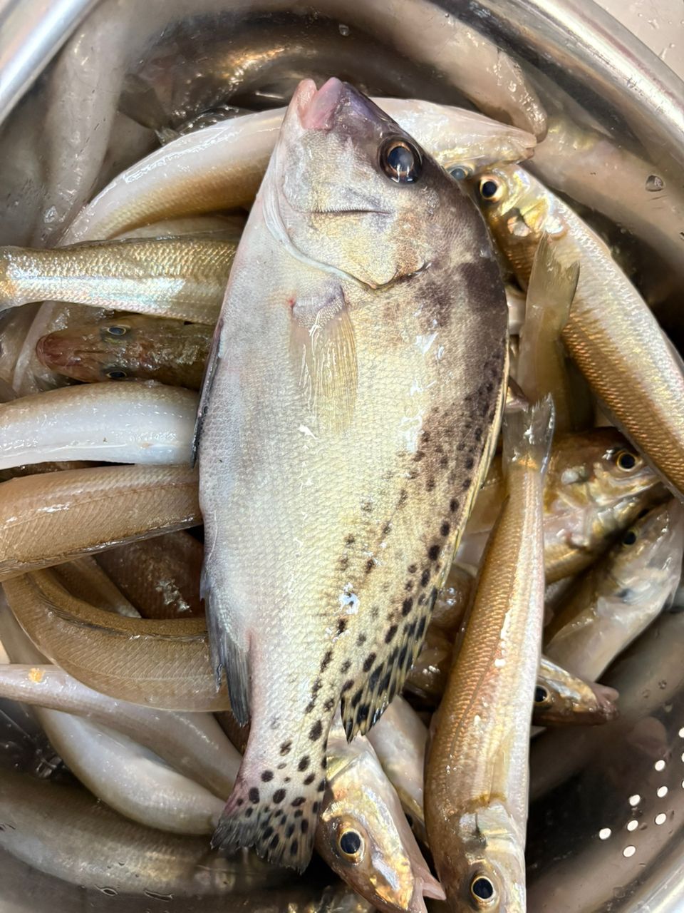 シロギス釣ってきました!ゲストにコショウダイ笑 初めて釣りました笑 変態様からもシロギスもらい山盛り〜😆当日は天ぷらと刺身にし、今日はフライにしました😋美味しかったです!!