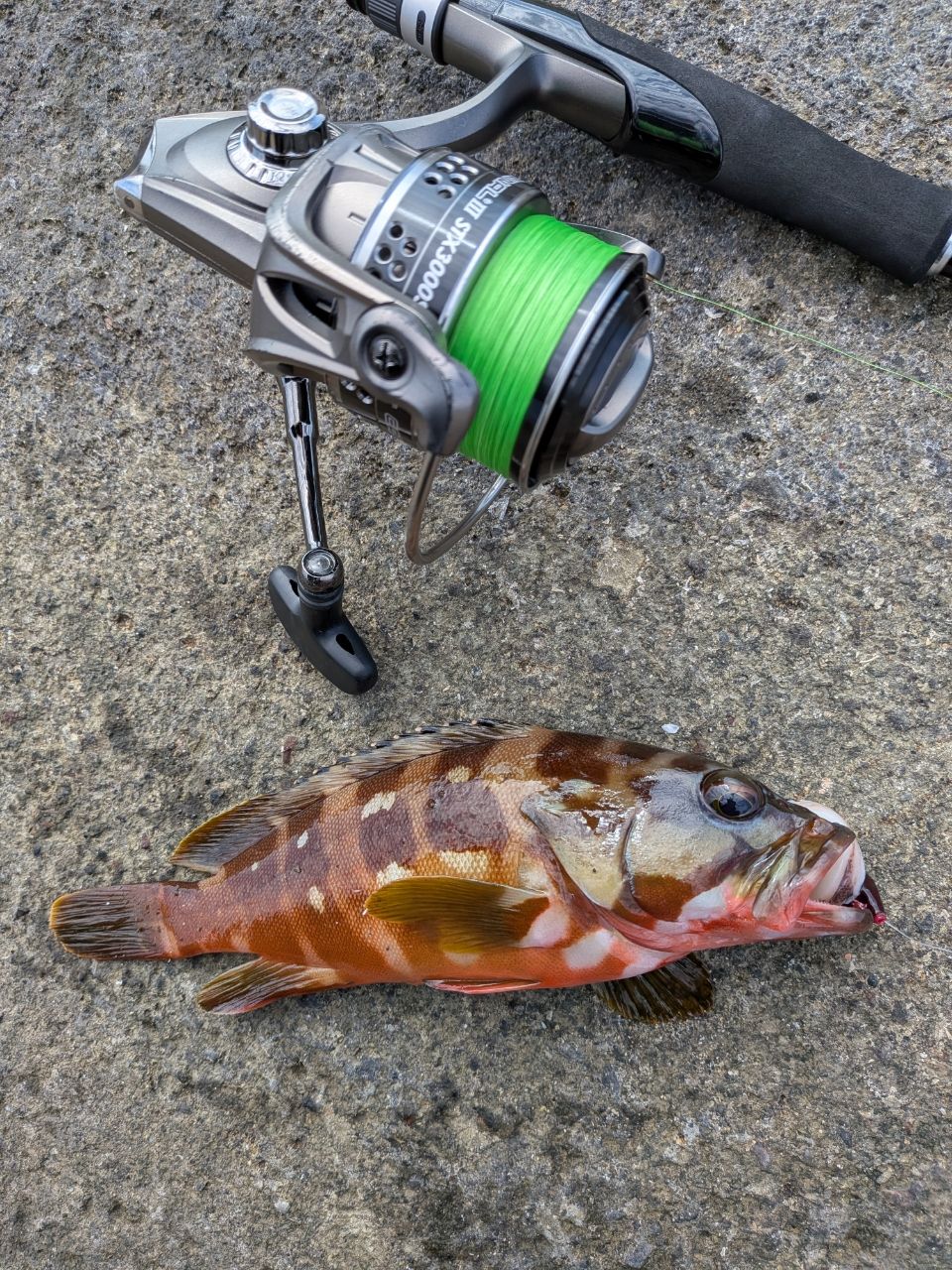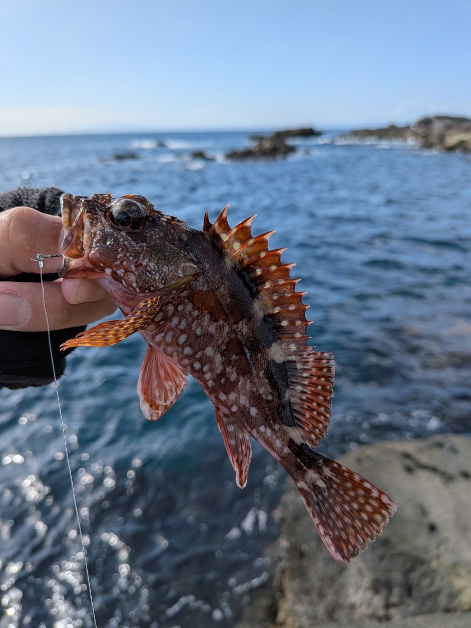 その後も沖のシモリの際をリフト&フォールしていると、カサゴ様👍✨続けて1番釣れて欲しかった、アカハタ様👍エギングロッドで根に突っ込むパワーをいなすのは中々スリリングでした😂✨