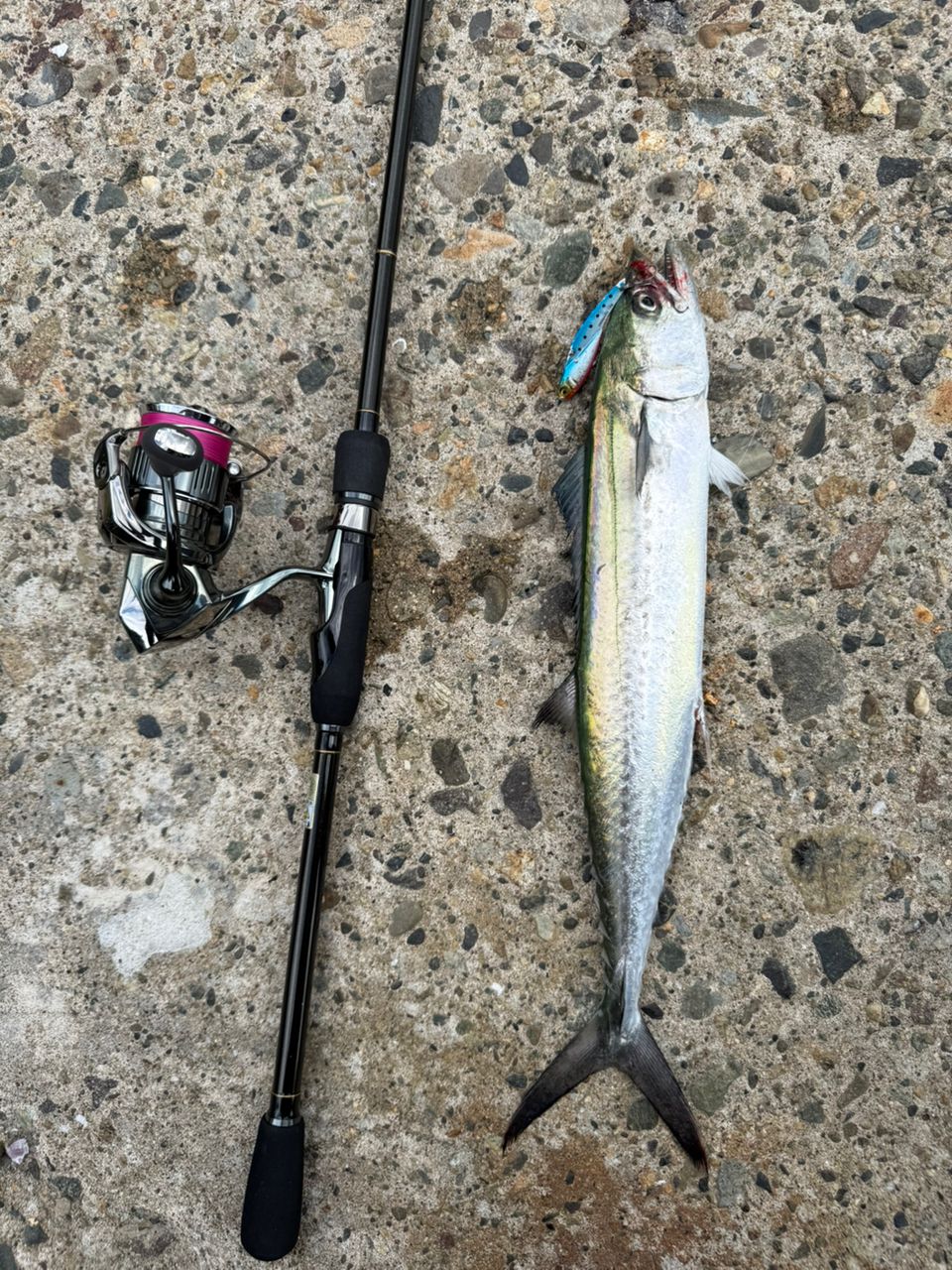 なんかシーバス釣れそうって雰囲気やったので1投目はオニマル投げたらサゴシやーん🐟 ここにもいるのね😅