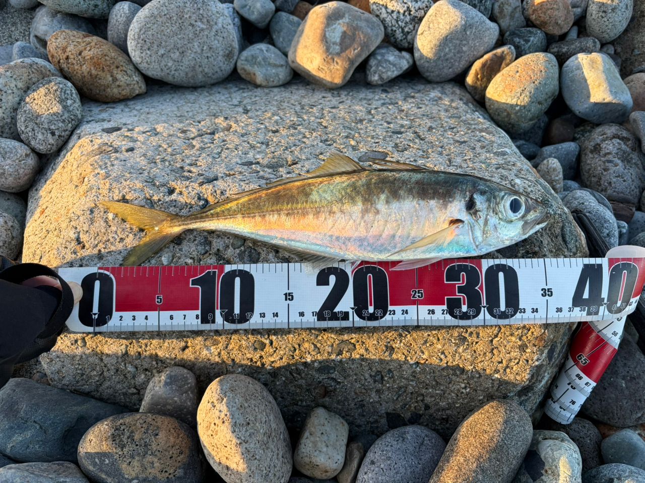 フクラギみたいにゴンゴン引かないけど割と重い引き。何かなと思ったら初めての尺アジ!嬉しい😄
