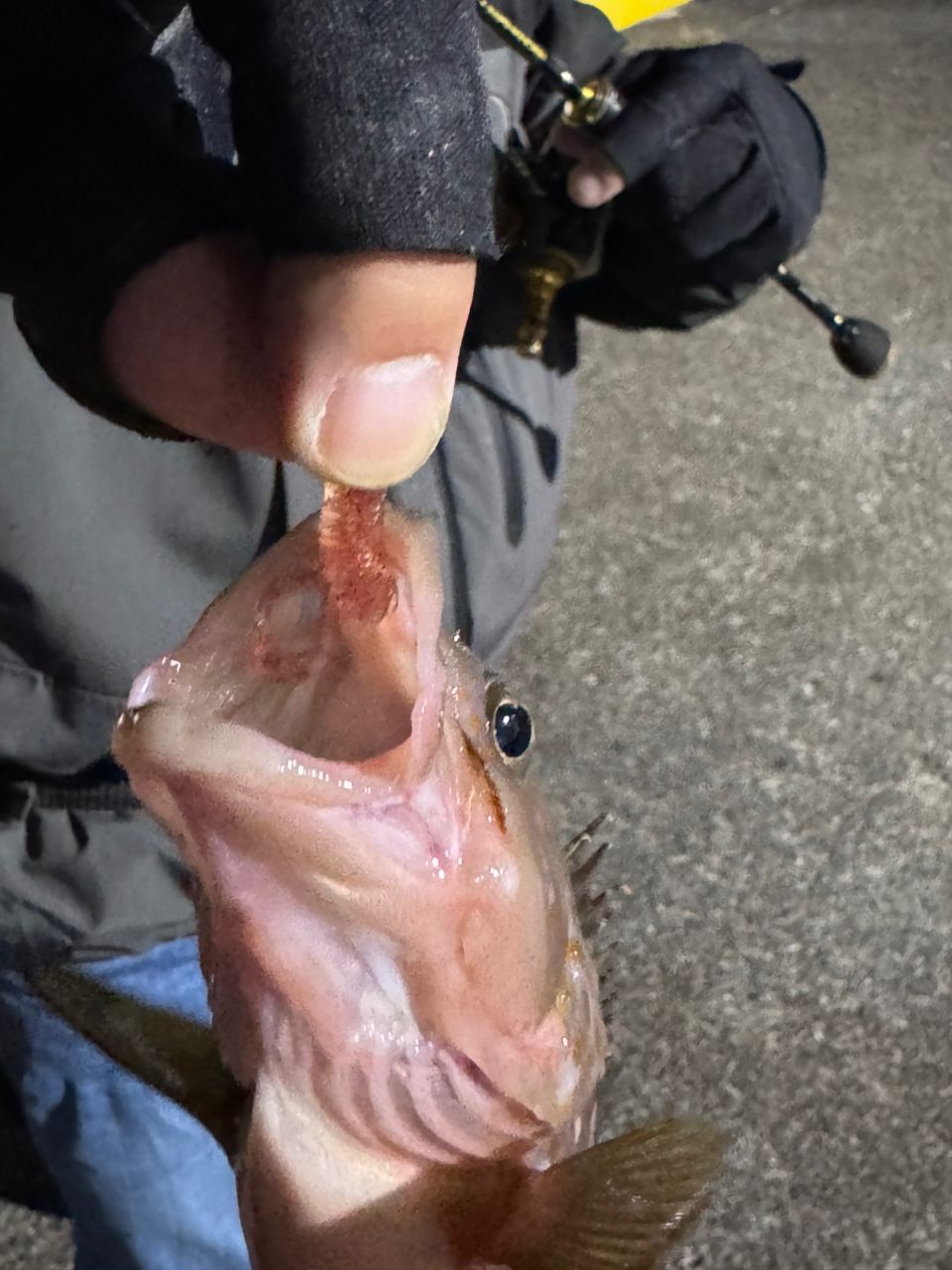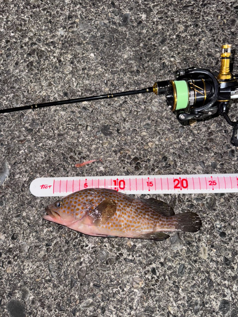 ゆっくり巻くと…グンっ!結構な引き😁上がってきたのはアコウ(キジハタ)初魚種めっちゃ嬉しかった😭